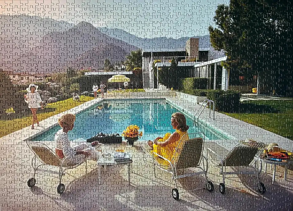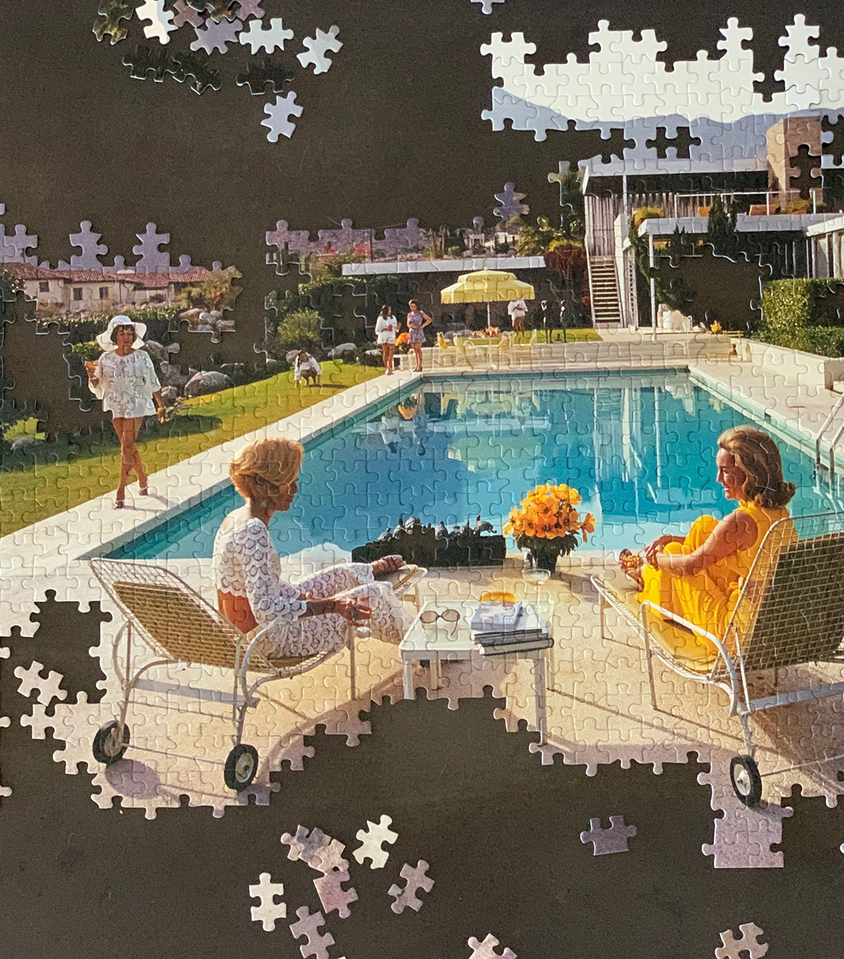 This 1,000-piece jigsaw puzzle features Slim Aarons' best-known photograph, Poolside Gossip, taken at a poolside party in Palm Springs, in 1970. The print is widely revered as the quintessential image of mid-century style and design.