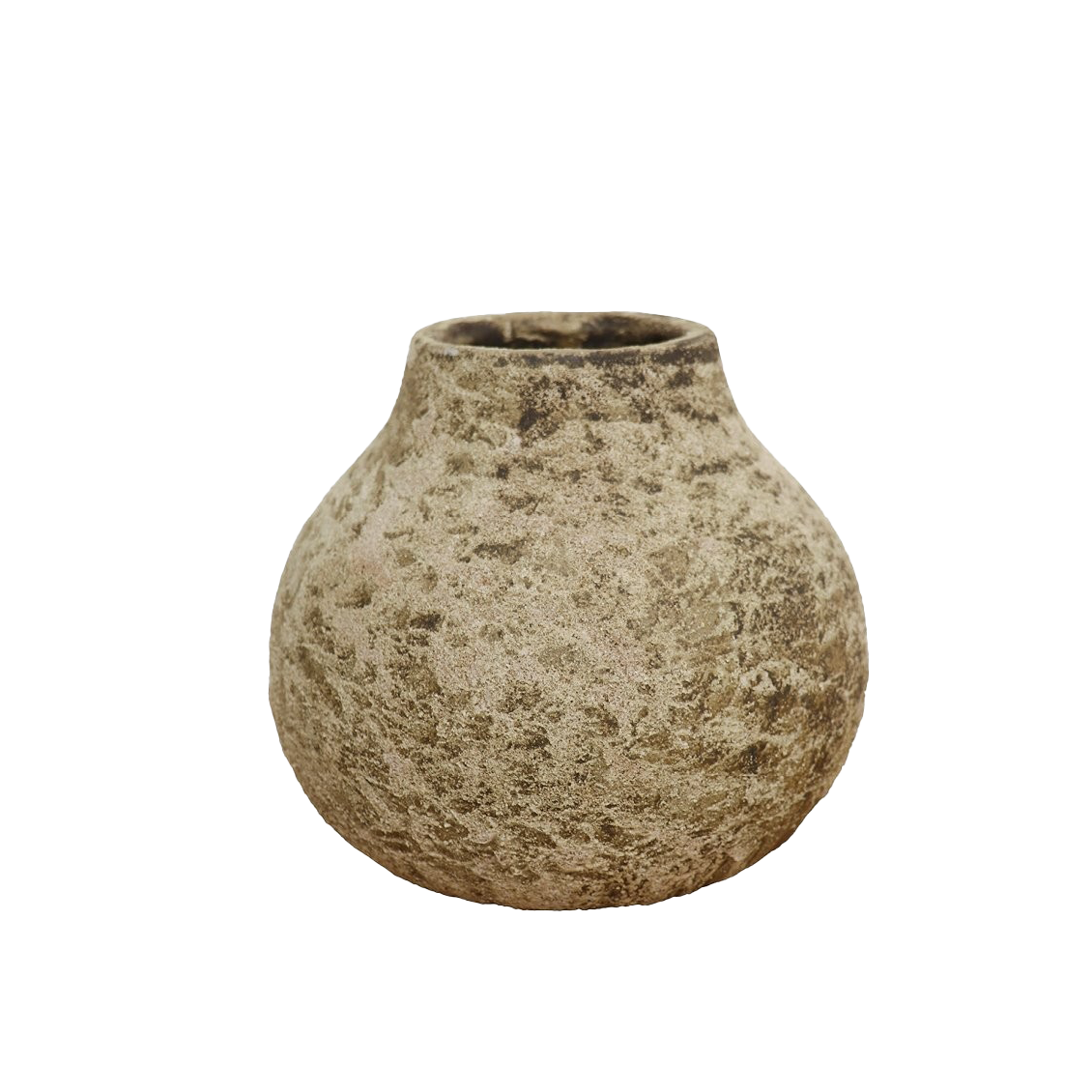 Handcrafted wide mouth earthenware vessel featuring a specialty glaze to create a rustic aged finish.