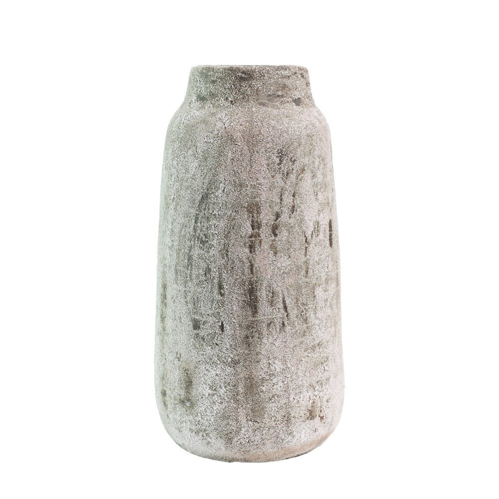 Tall handcrafted earthenware vessel featuring a specialty glaze to create a rustic aged finish.