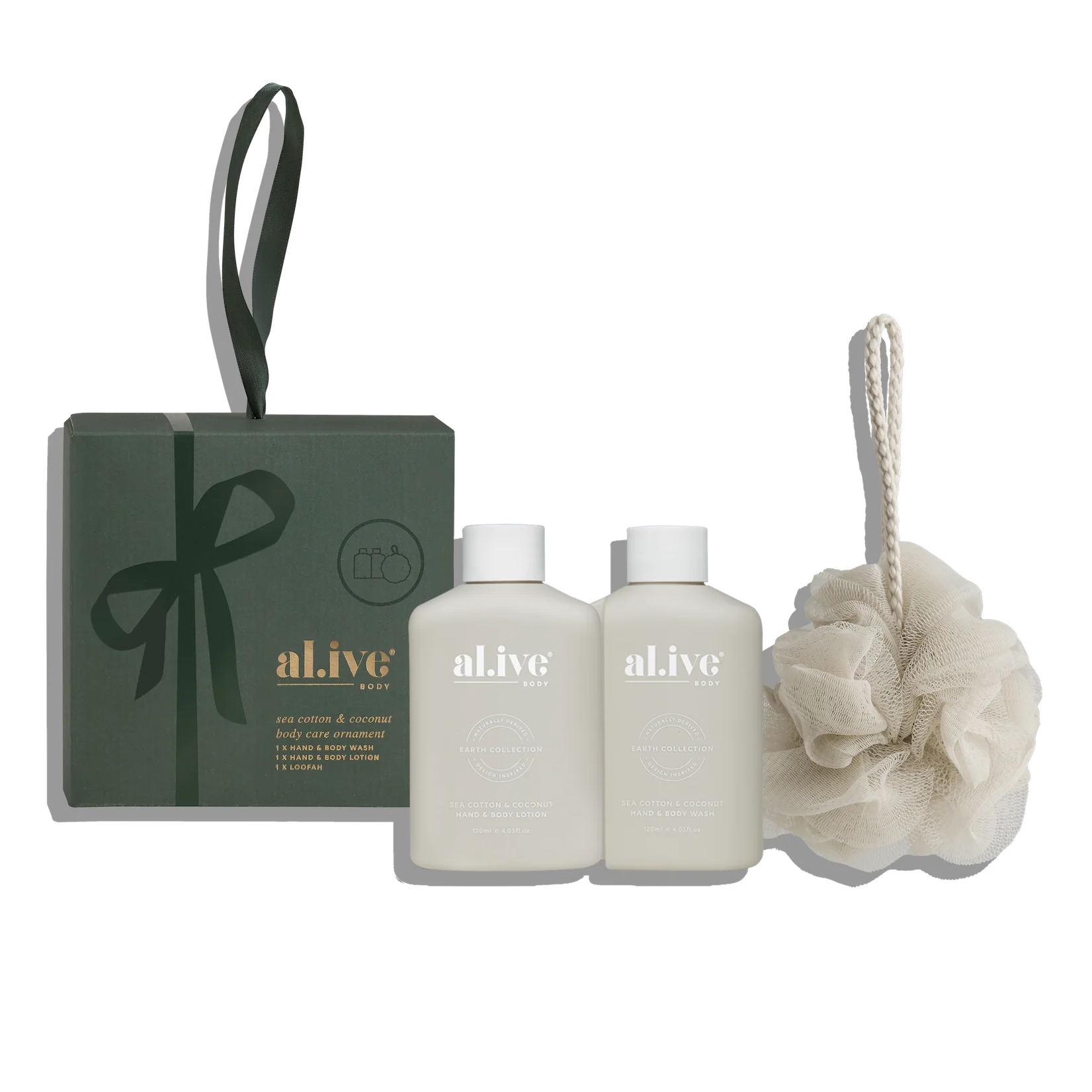 Sea cotton & coconut travel duo in charming bauble packaging with natural sponge included. Features Body Wash and Lotion perfect for holidays away - functional luxury that doubles as festive tree decoration.