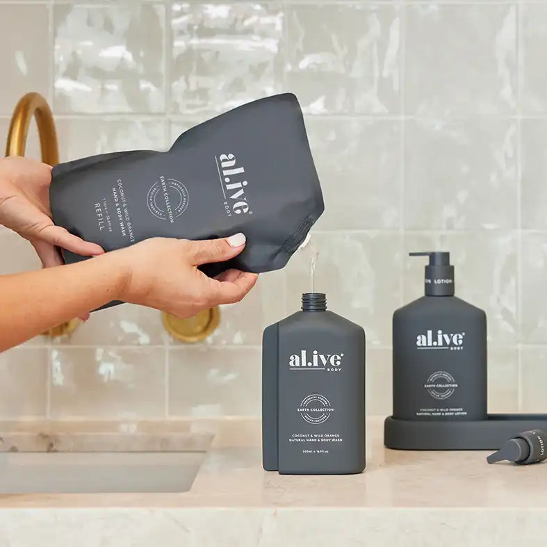 The refill pouches use 88% less plastic and refill your 500ml al.ive body bottle twice. The pouches are 100% recyclable, just peel off the sticker from the front and back of the pouch and dispose in your recycling bin at home.