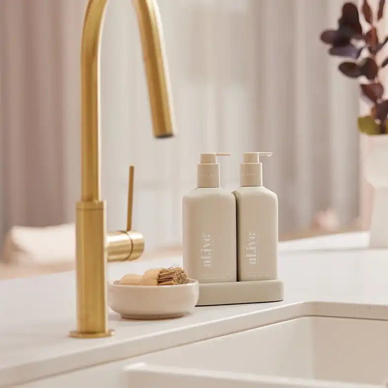 The Al.ive kitchen duo looks great yet is practical and it is elegantly presented to elevate your countertop. The set includes a lemon and pomegranate dishwashing liquid, a watermelon and lime hand wash, and a matching tray.