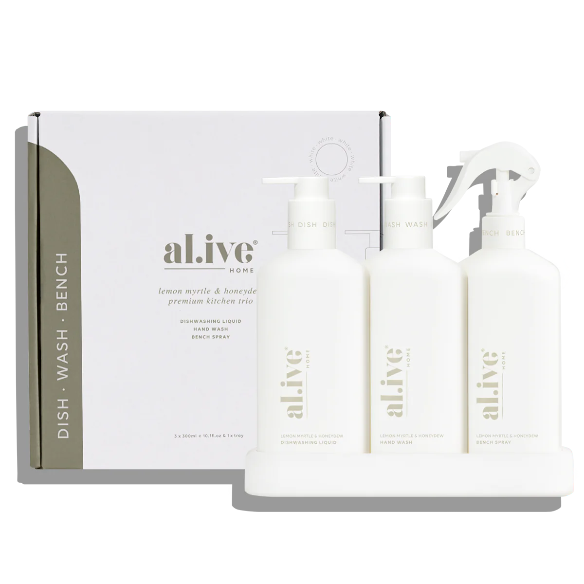 Introducing the premium kitchen trio in lemon myrtle & honeydew - the ultimate solution for your kitchen cleaning needs. This set includes dishwashing liquid and bench spray as well as a hand wash. These are all conveniently nestled within a matching tray.