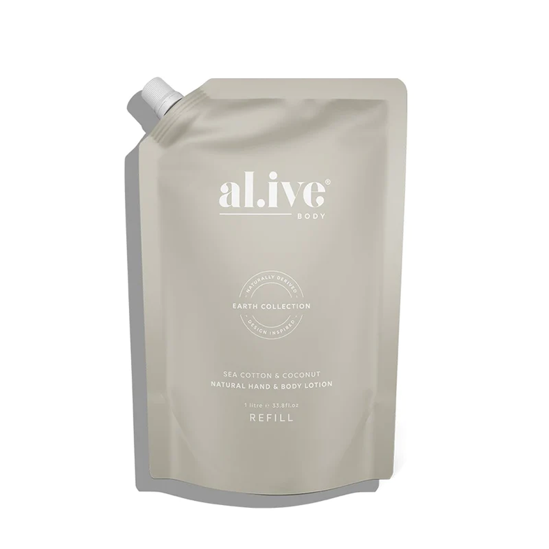 The Al.ive sea cotton & coconut hand + body lotion refill contains a luxurious blend of naturally derived ingredients, fortified with essential oils and native botanical extracts.
