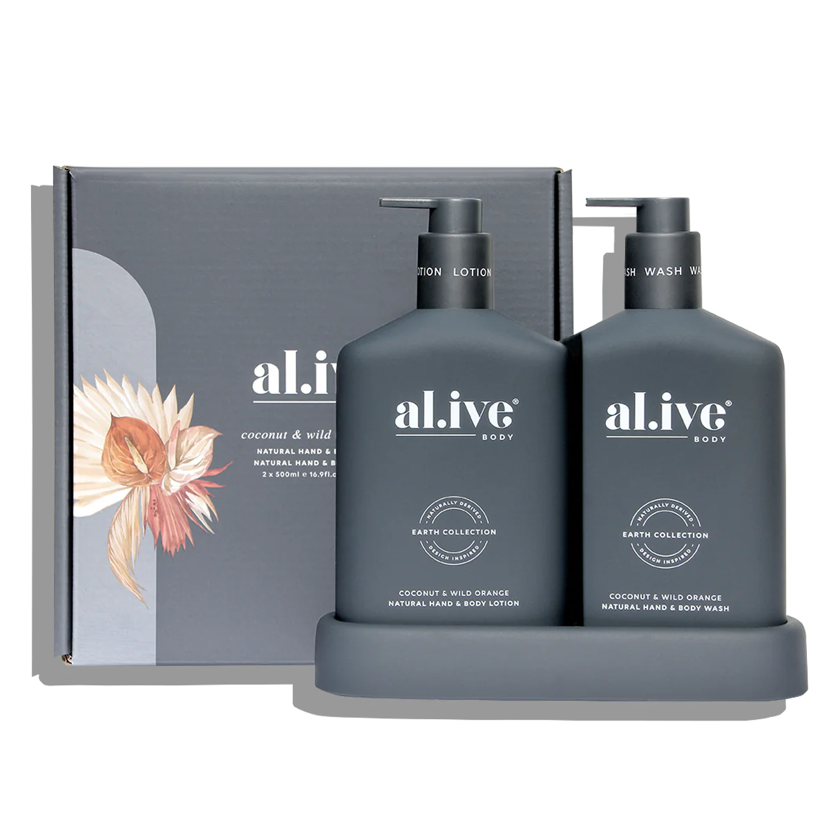 The Al.ive wash + lotion duo includes a bottle of hand & body wash, a bottle hand & body lotion and a matching tray.