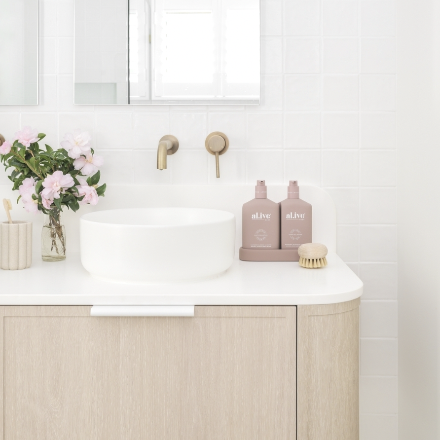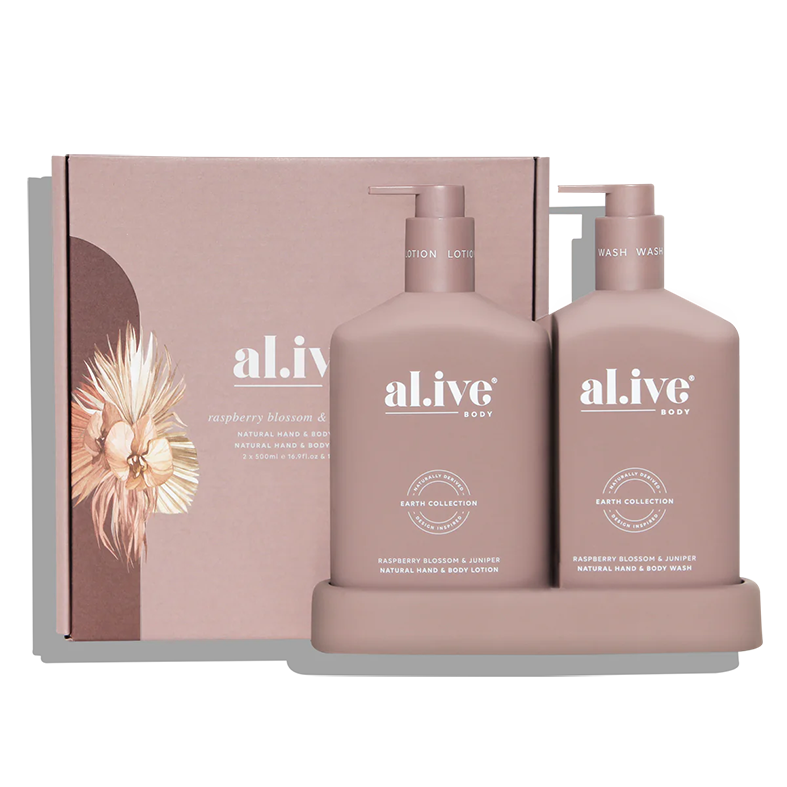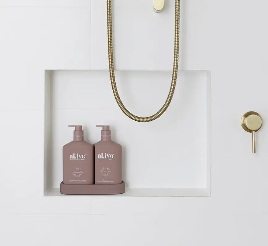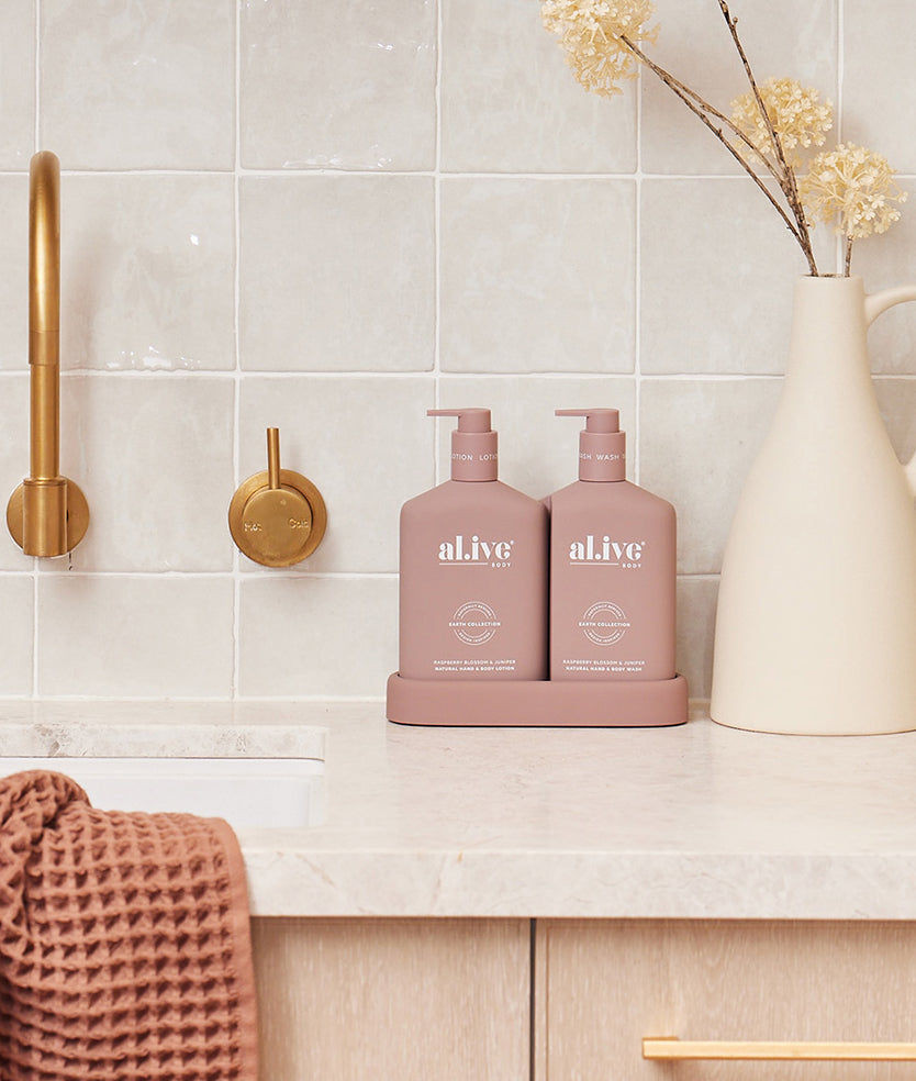 The Al.ive wash + lotion duo includes a bottle of hand & body wash, a bottle hand & body lotion and a matching tray.