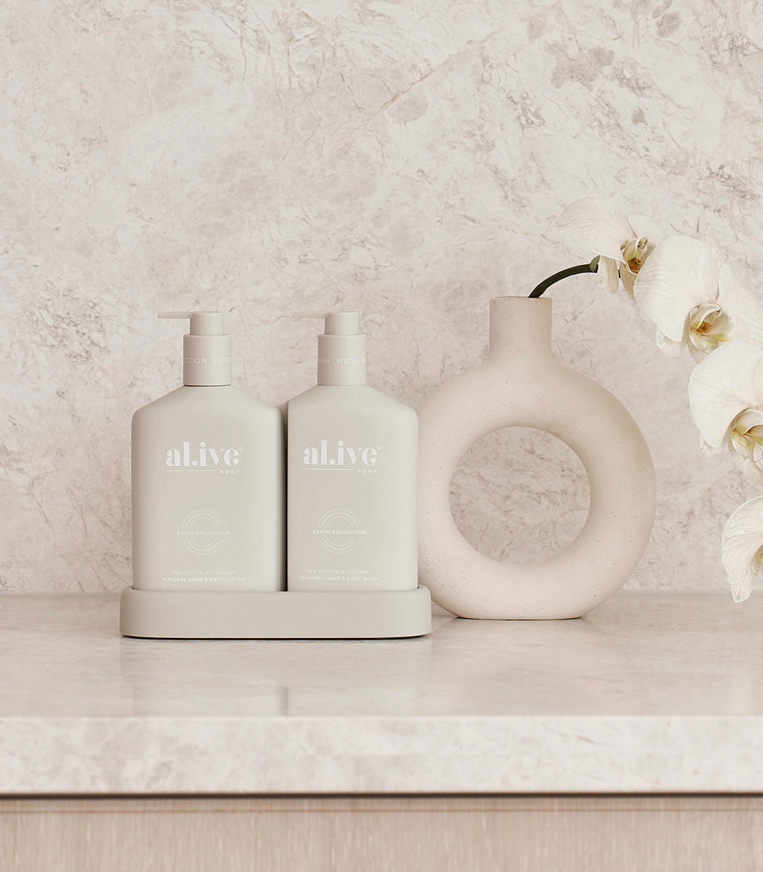 The Al.ive wash + lotion duo includes a bottle of hand & body wash, a bottle hand & body lotion and a matching tray.