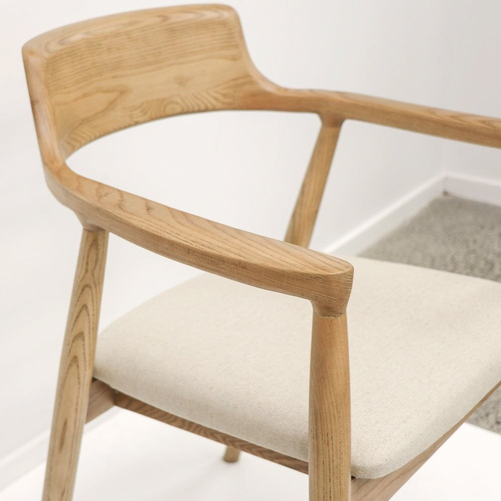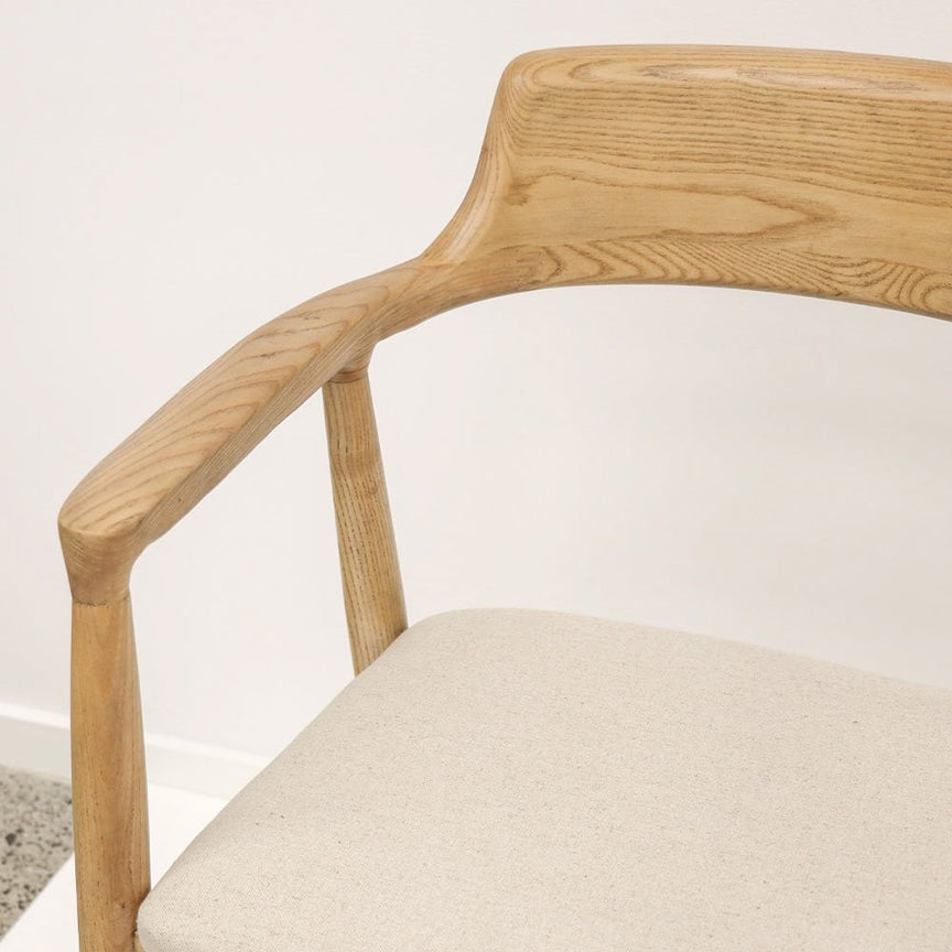 The ash wood dining chair showcases a carefully curved back which transitions easily into armrests, and an upholstered linen seat ensures comfort for hours.