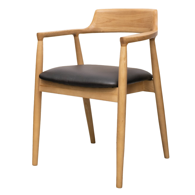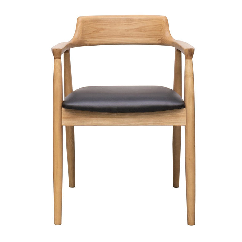 The ash wood dining chair showcases a carefully curved back which transitions easily into armrests, and an upholstered leather seat ensures comfort for hours.