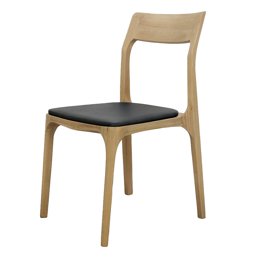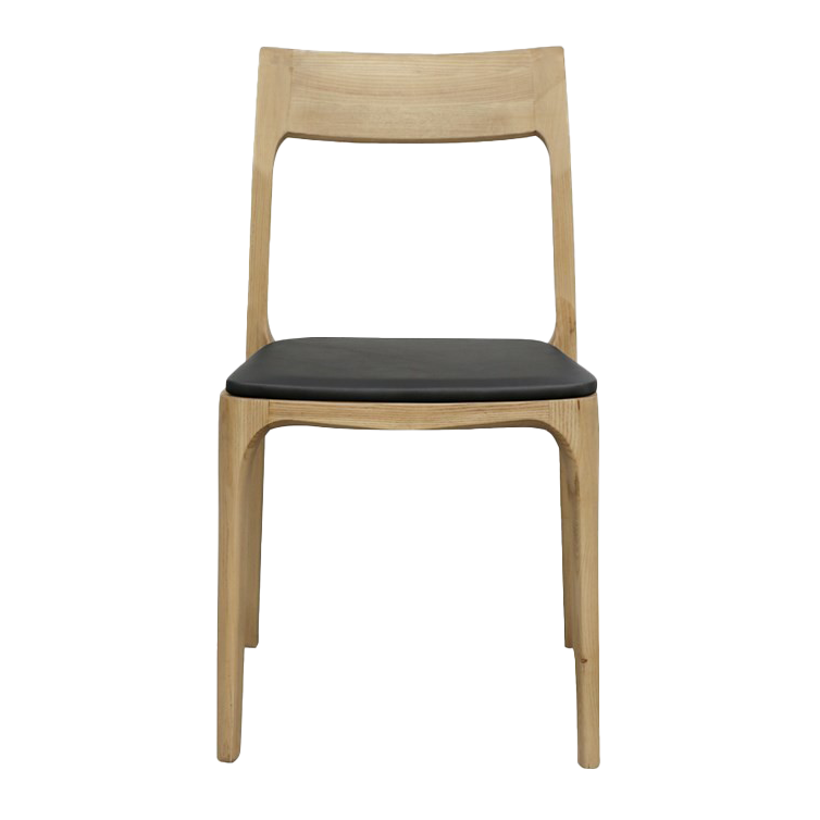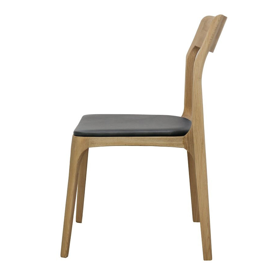 The natural ash wood dining chair has a curved back and a black leather upholstered seat. These chairs conveniently stack together.