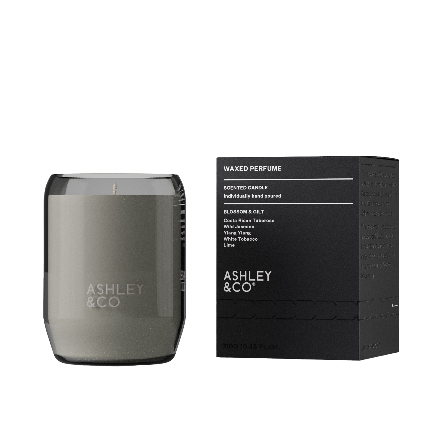 The candle is fragranced with one of Ashley & Co’s signature scents, Blossom & Gilt. The scent is of Costa Rican tuberose and wild jasmine.