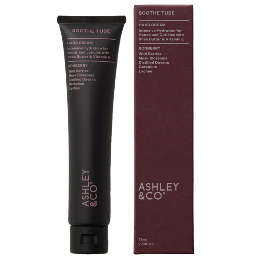 Ashley & Co's Soothe Tube hand cream smells great as well as being good for your skin. The intensive hydrating cream is a rich, yet non–greasy aromatic natural blend for parched hands & cuticles. The combination of shea butter, camomile extract & vitamin E soothes and nourishes hands.