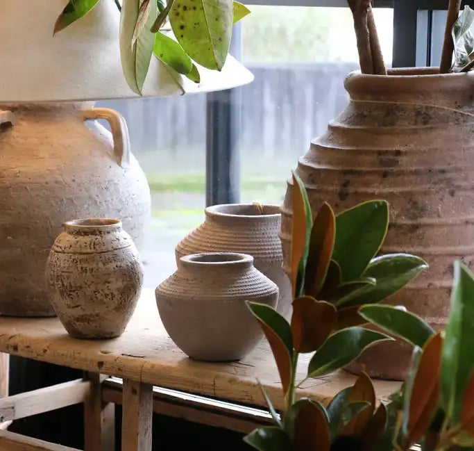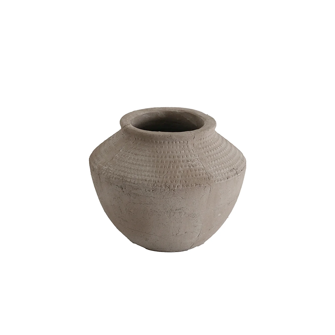 Rustic terracotta urn with a textured finish in a sandy natural colour.