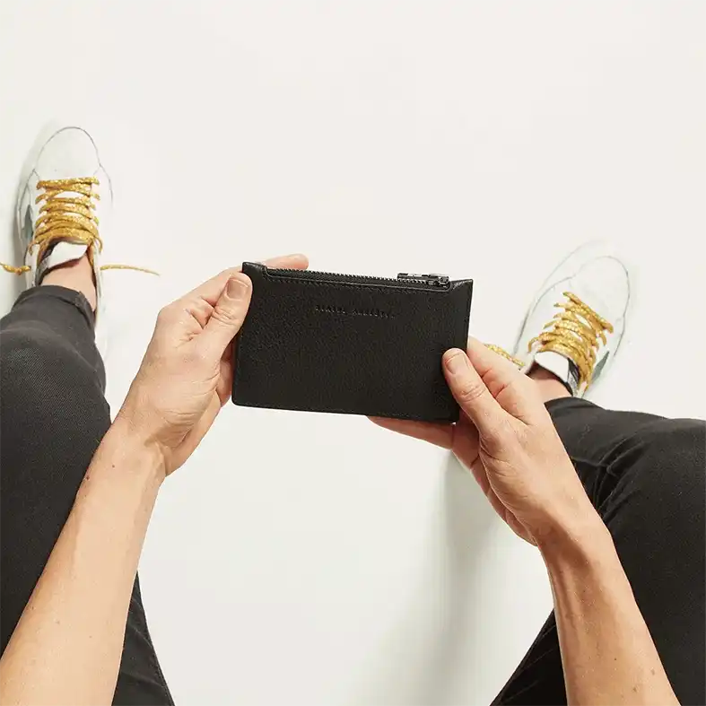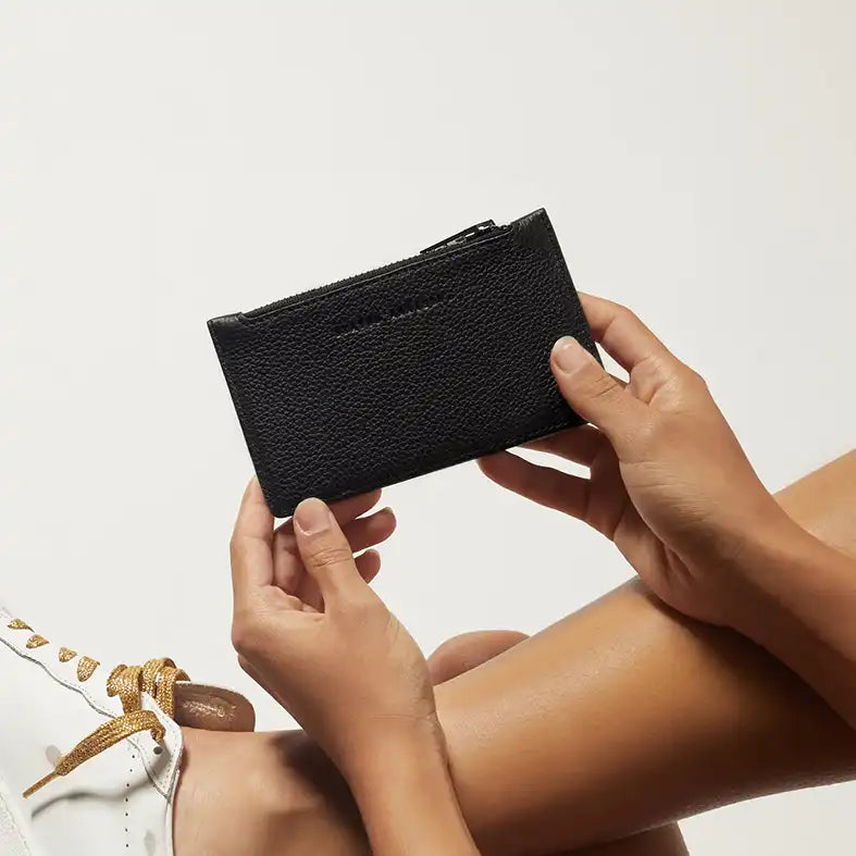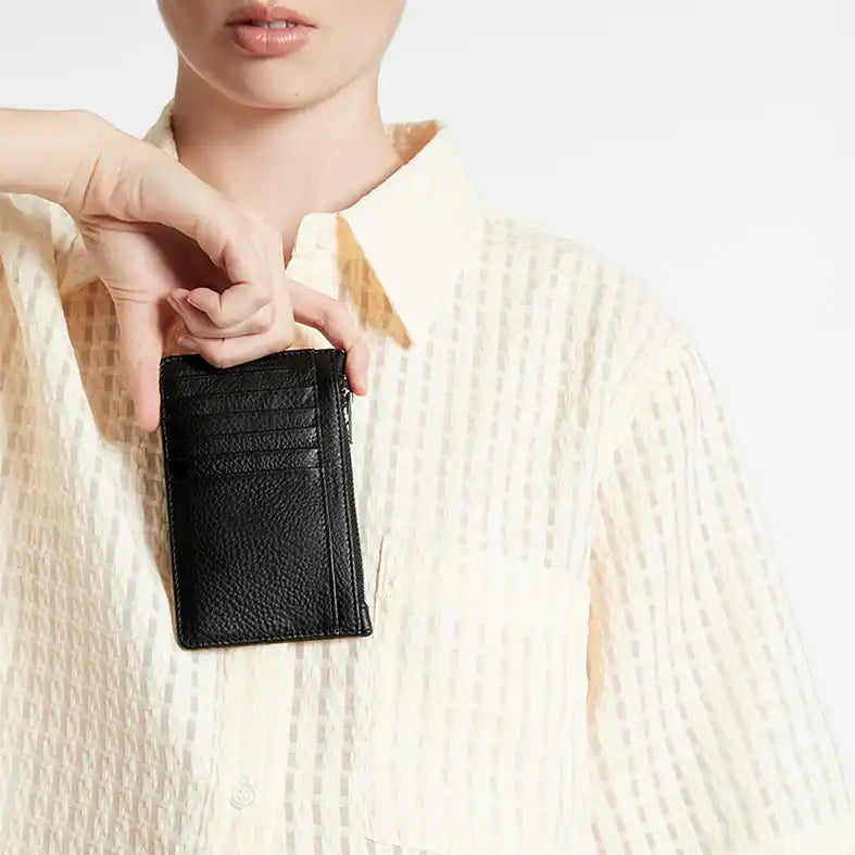 Featuring 6 card slots that can fit up to 12 cards, a zipper zone for coins and side open pocket to stash receipts or cash.