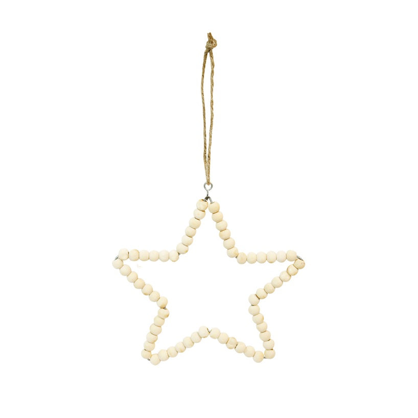 Natural beaded wooden star hanging Christmas decoration.