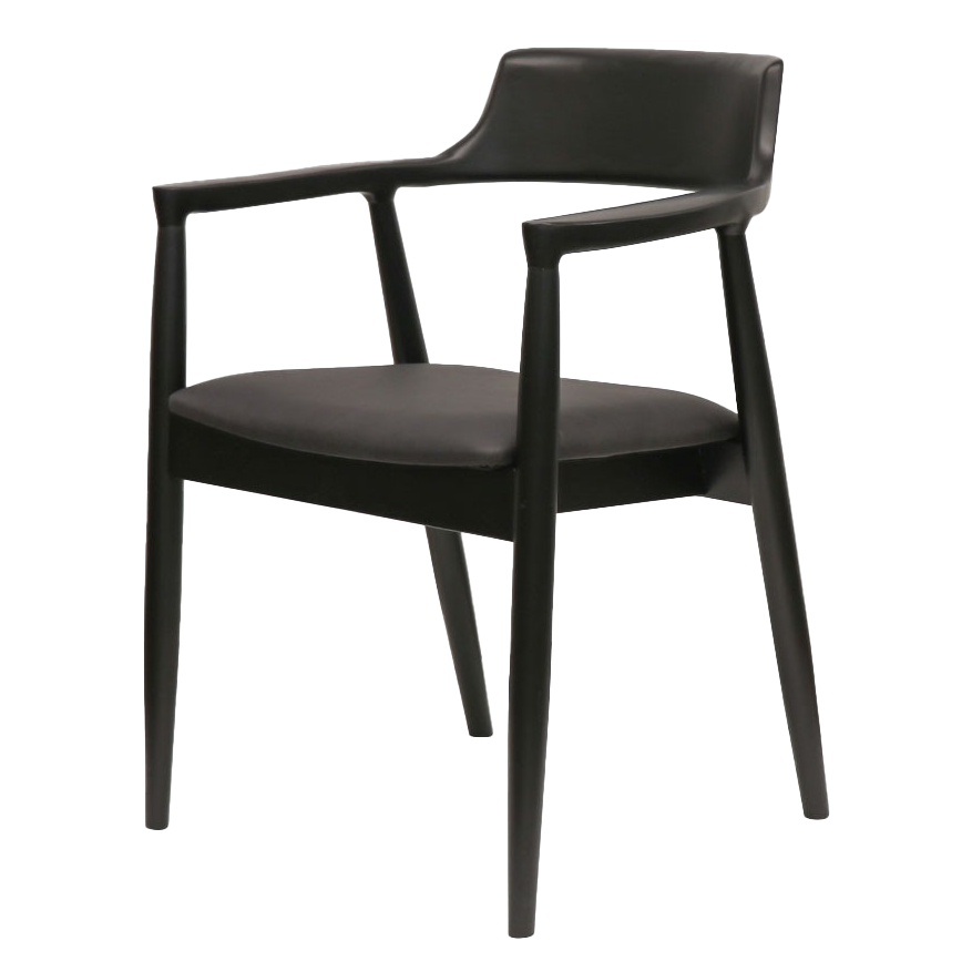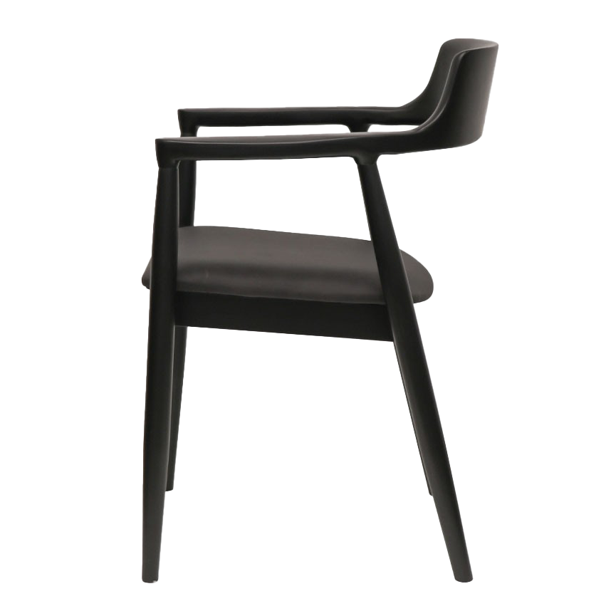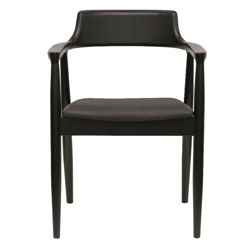 This black ash wood dining chair showcases a carefully curved back which transitions easily into armrests, and an upholstered black leather seat ensures comfort for hours.