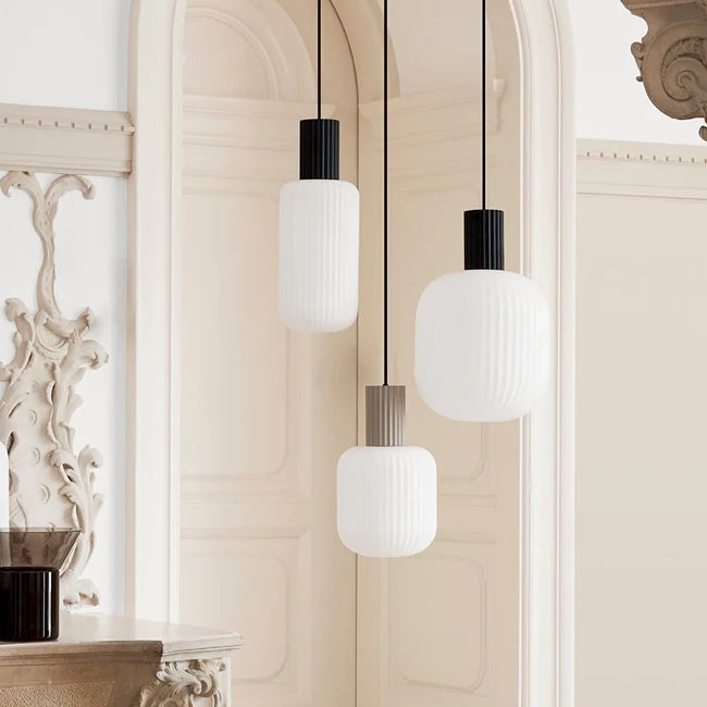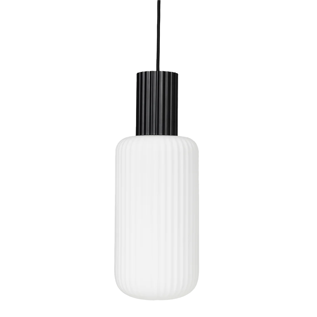 This pendant features a beautiful, ribbed surface following the black metal base to the opal glass shade, which illuminates the room with a soft and warm light.