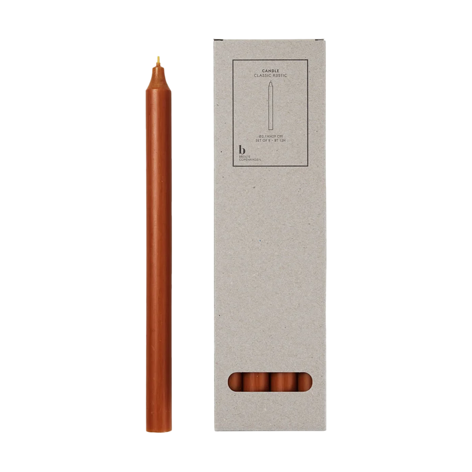 A set of eight terracotta coloured, non-drip taper candles. designed by Danish brand, Broste Copenhagen.