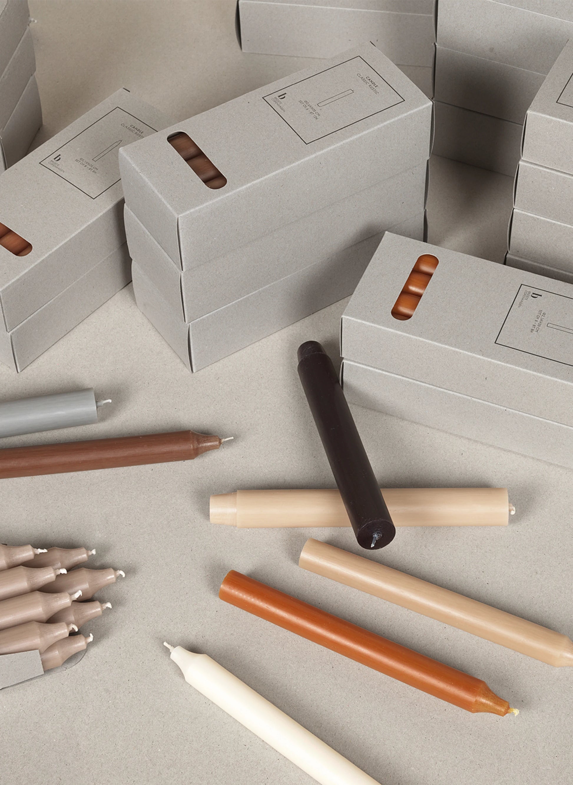 A set of 8 soft taupe coloured, non-drip taper candles. designed by Danish brand, Broste Copenhagen.