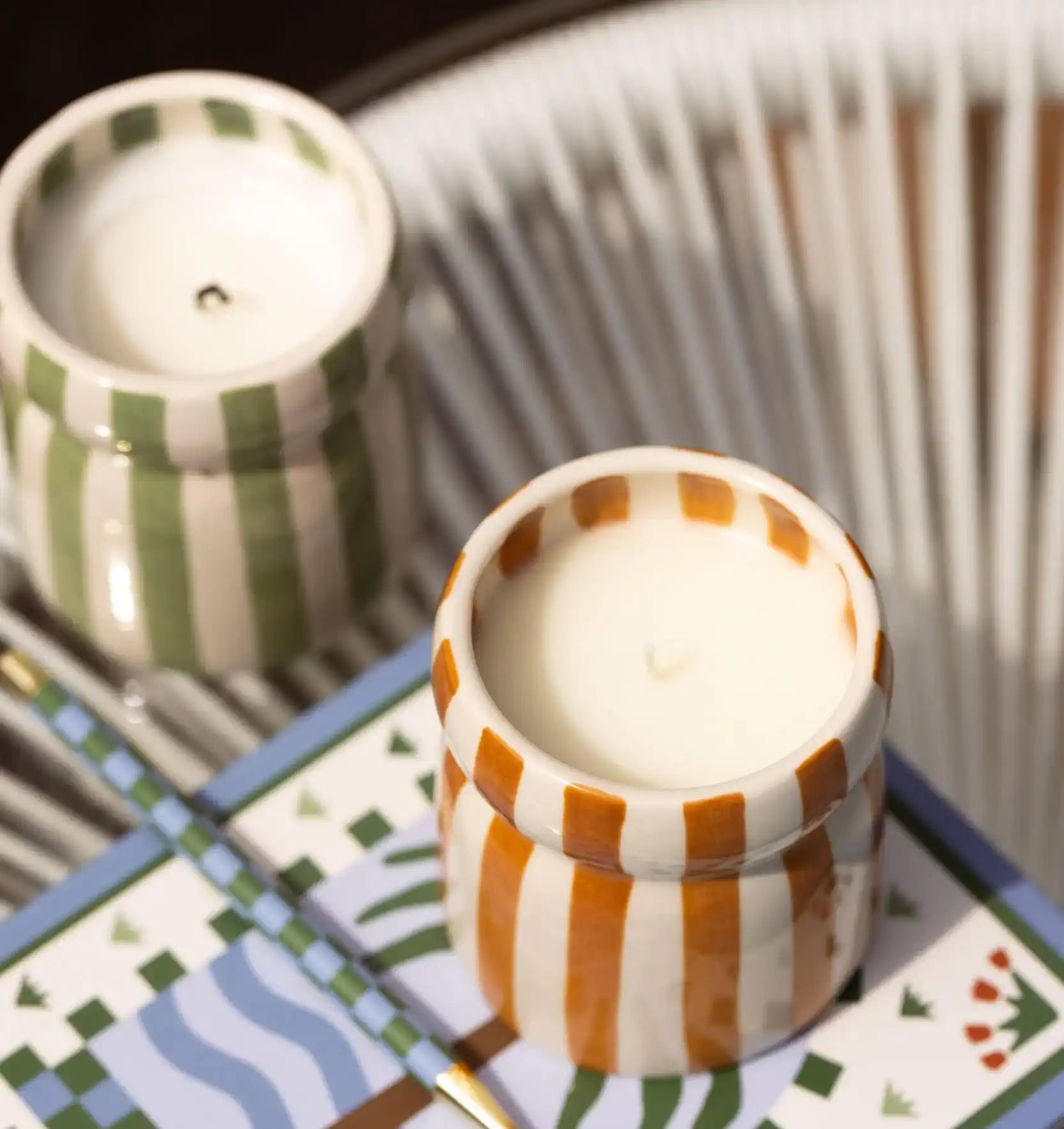 These hand painted candles are inspired by the striped umbrellas of beaches around the world.