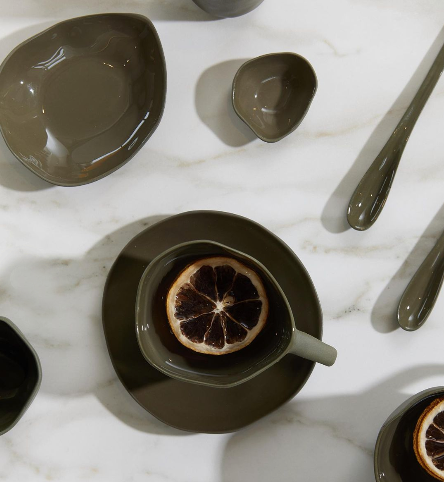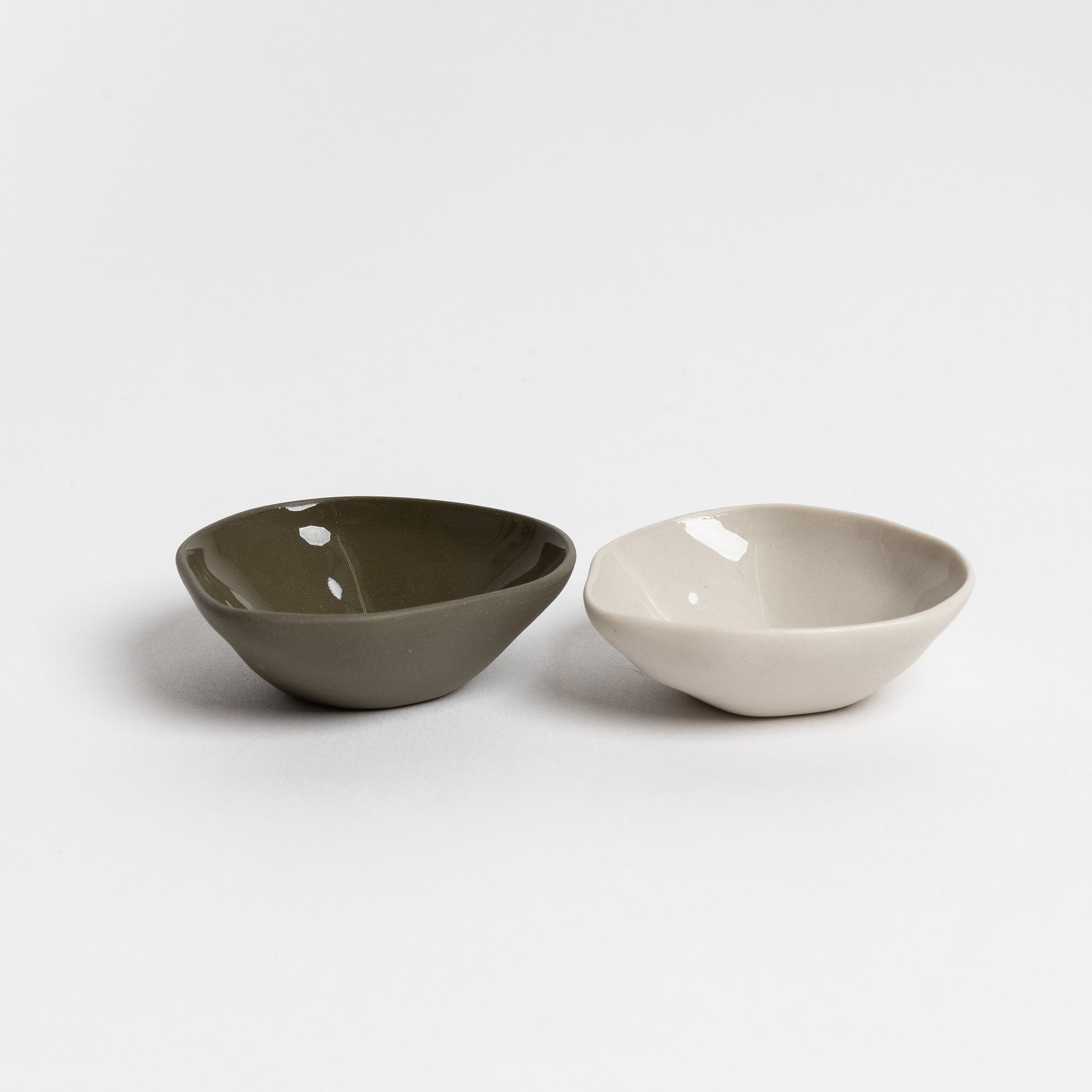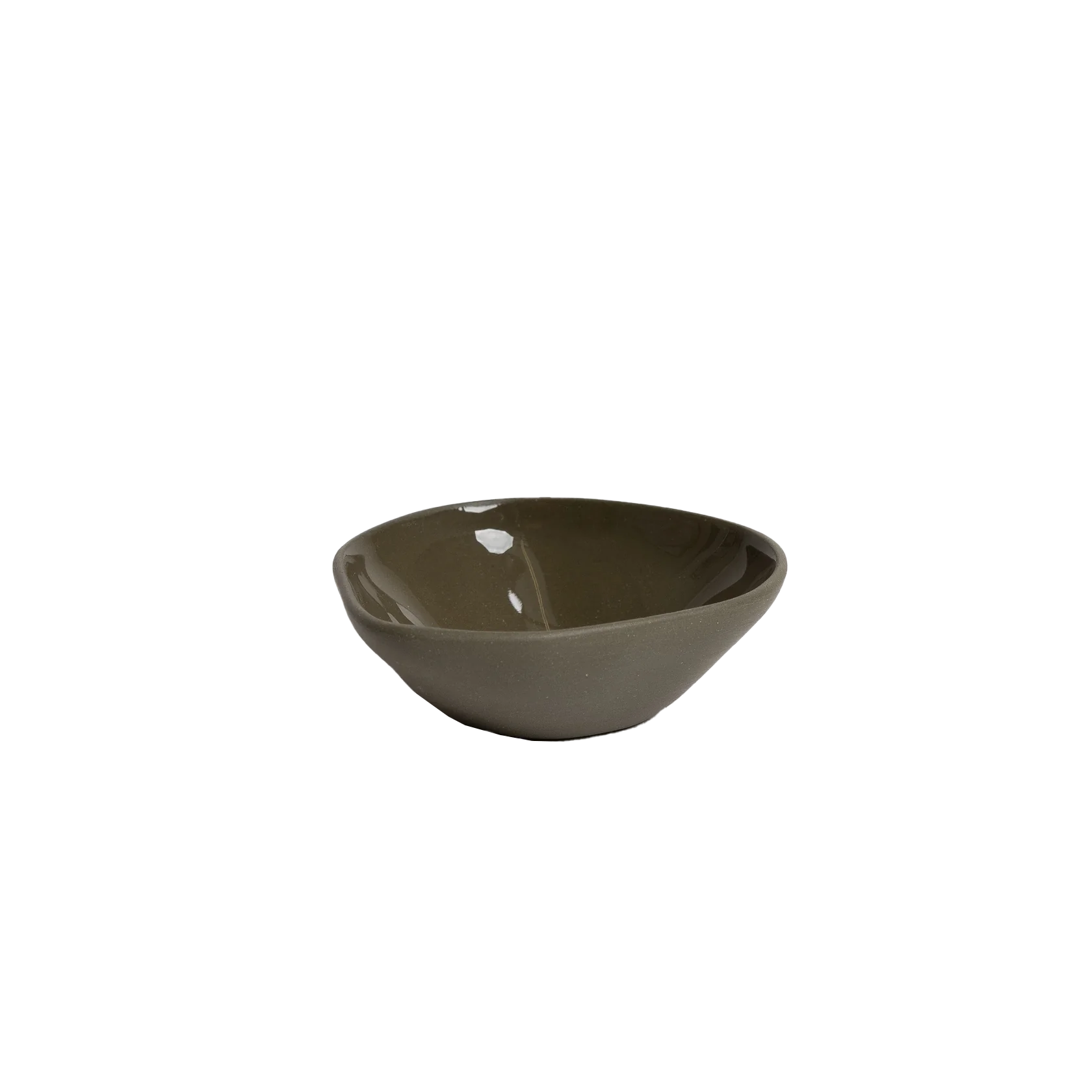 Organic shaped small stoneware condiment dish with a matte exterior and a glazed interior.