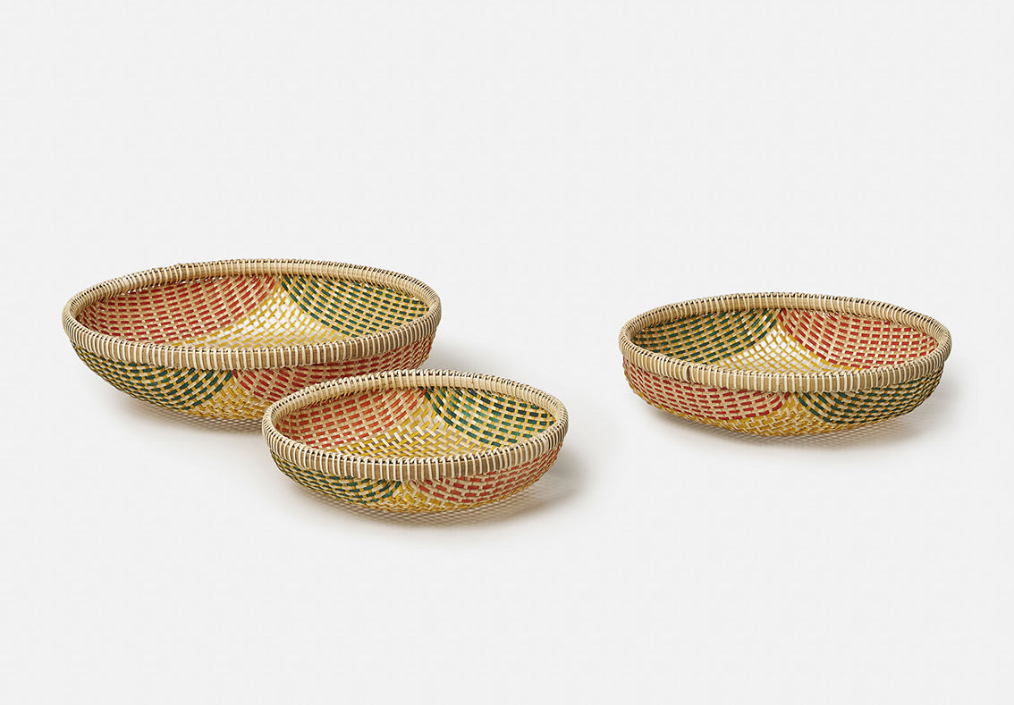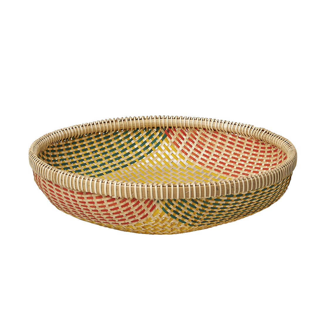 The basket designer drew inspiration from Vietnam’s vibrant street markets, where vendors display fresh produce in large, shallow plastic baskets. This reinterpretation replaces plastic with sustainable bamboo and features a bold, dynamic colour palette. Display as an art piece or as a functional storage solution.