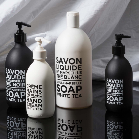 The soap is saponified in a cauldron using traditional methods and presented in a contemporary lacquered glass pump bottle.