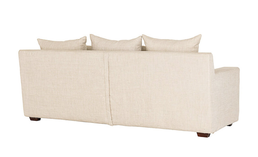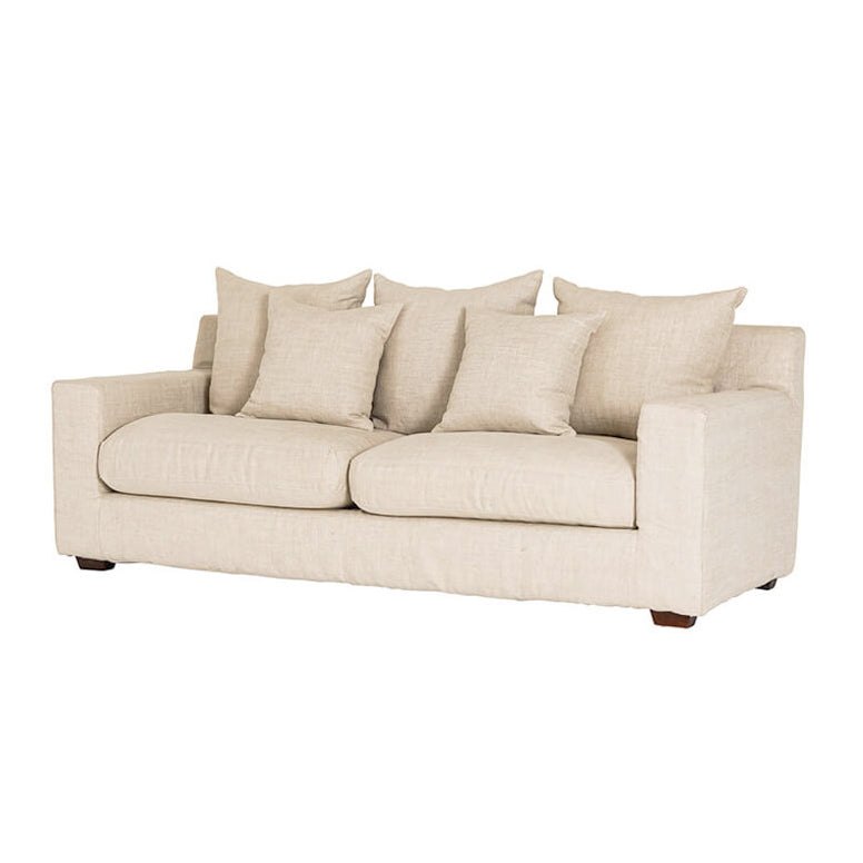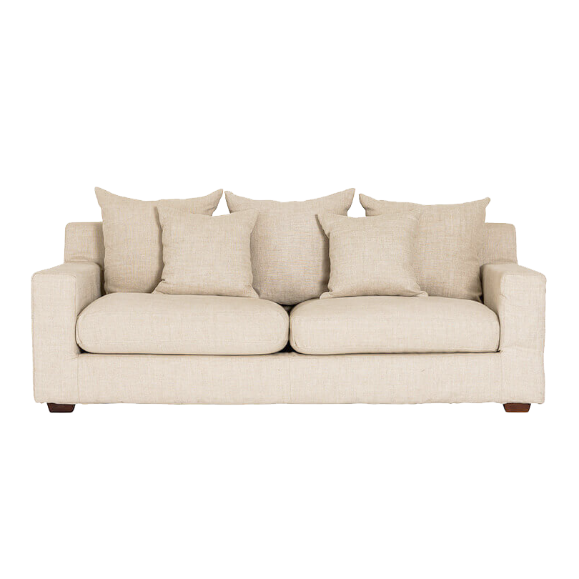 This 100% linen sofa has unprecedented sink-in comfort, with a deep seat and five cushions for laidback lounging.