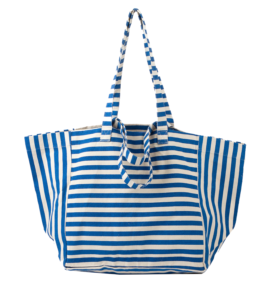The striped blue and white tote features a generously sized internal slip pocket, perfect for keeping your keys and purse at hand. This cotton tote ideal for shopping, the beach or a visit to the markets.