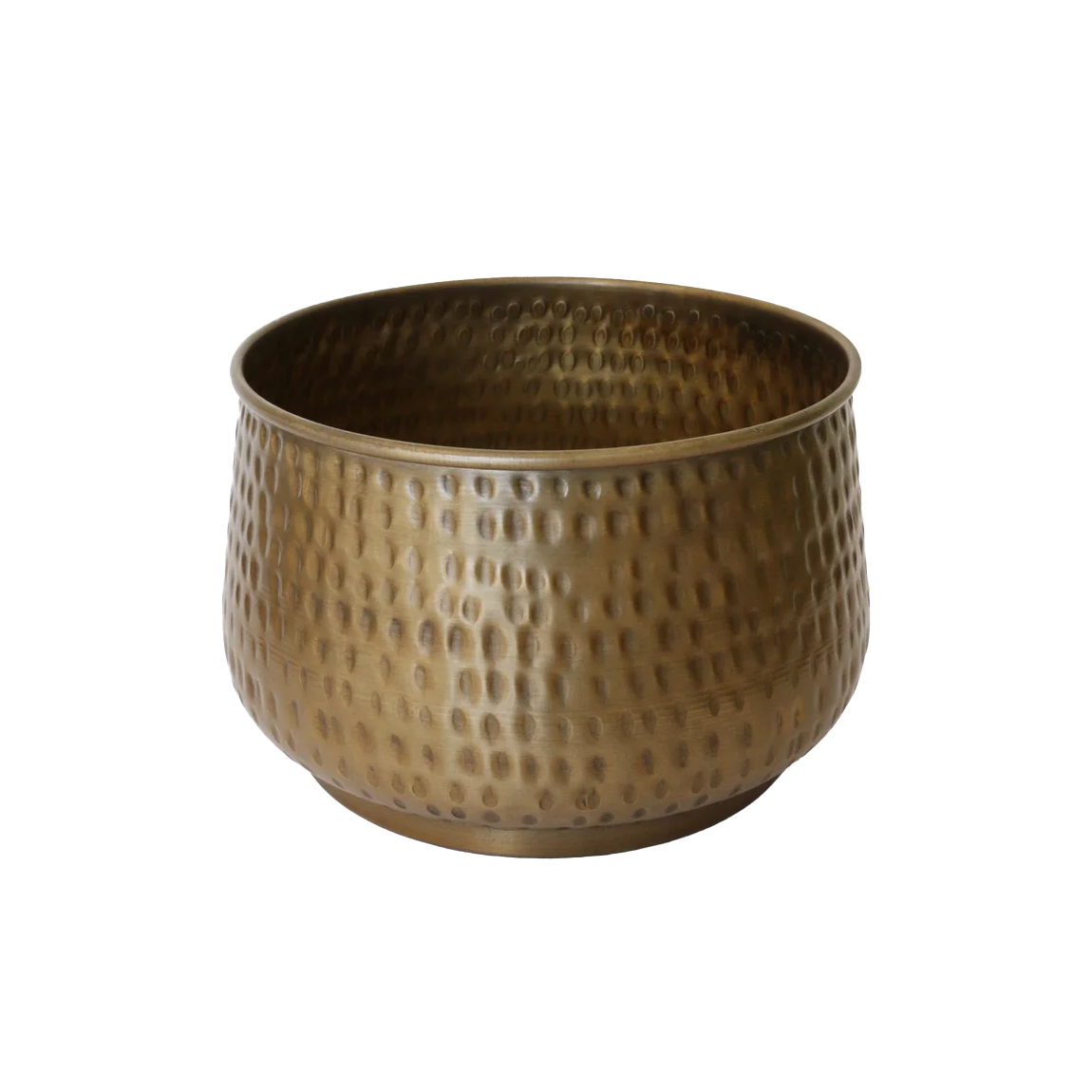 This planter has a burnished brass-look finish, with an organically dimpled texture.