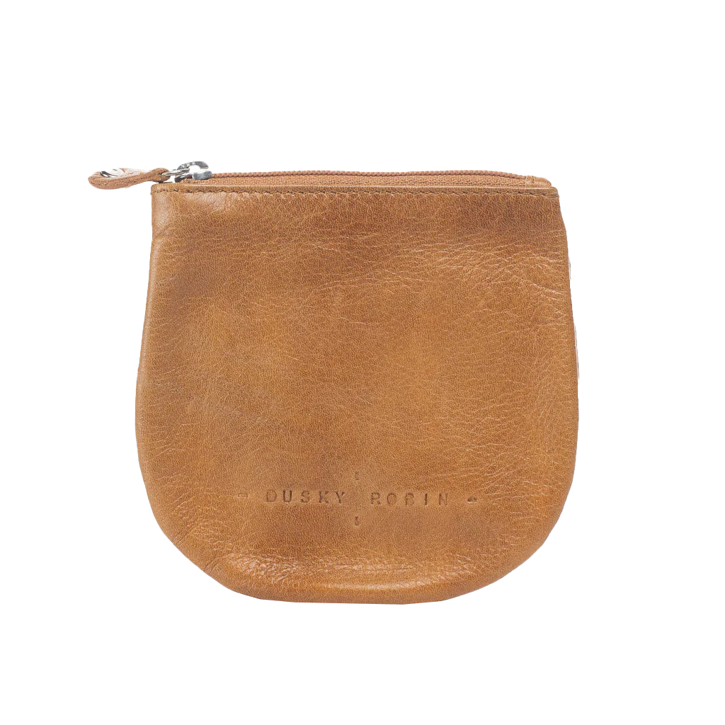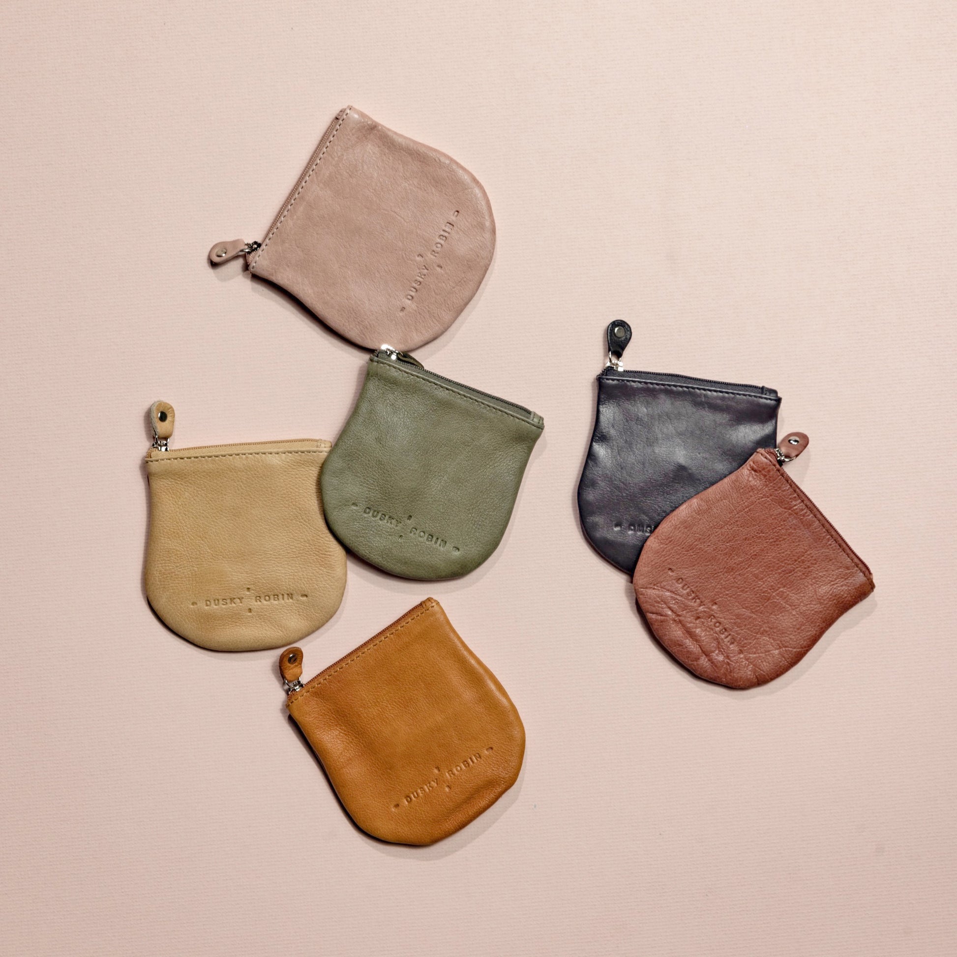 The Lilly Coin Purse is made of super soft leather. It has a zip closure at the top with a curved base.