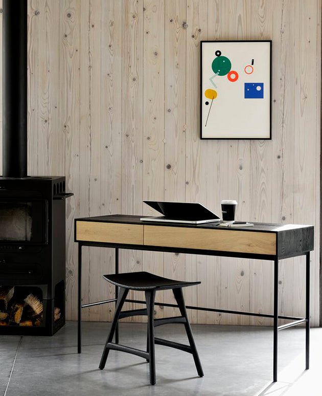Combining soft round legs and eye-catching graphic lines, the Blackbird console desk features two drawers.