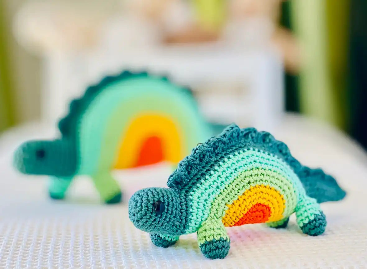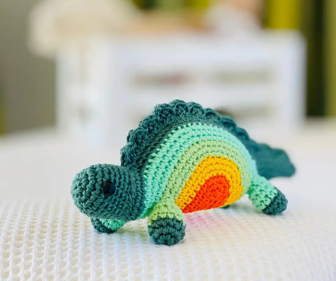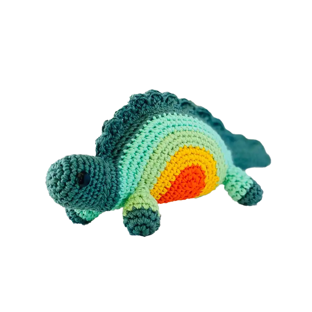 This colourful Fairtrade crochet knit stegosaurus toy will be enjoyed by all dino-loving children.