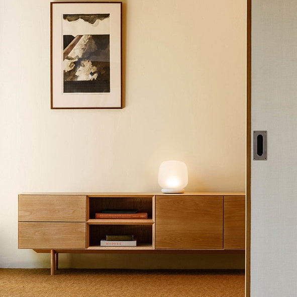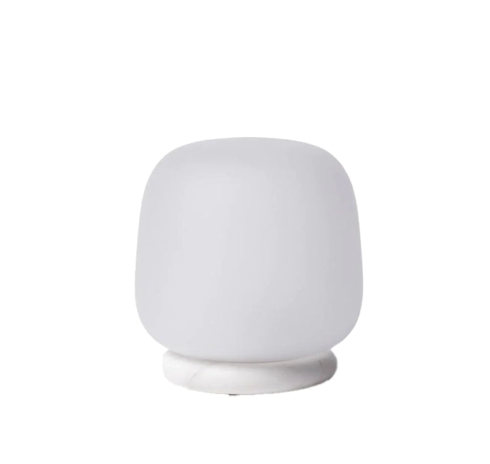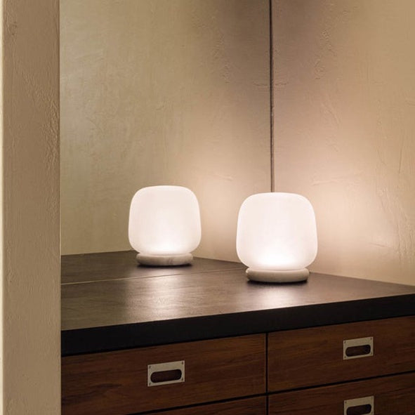 The shade is crafted from hand-blown frosted glass and the base is made from solid marble. A dimmable LED light source means the lamp creates a subtle, sophisticated glow.