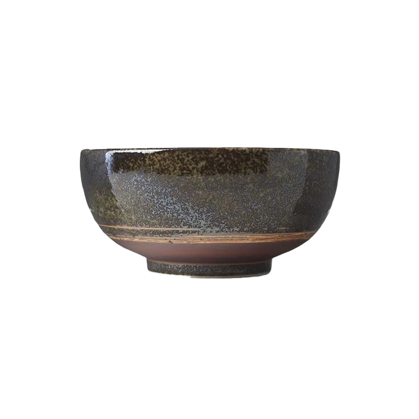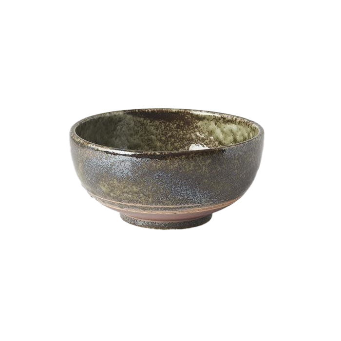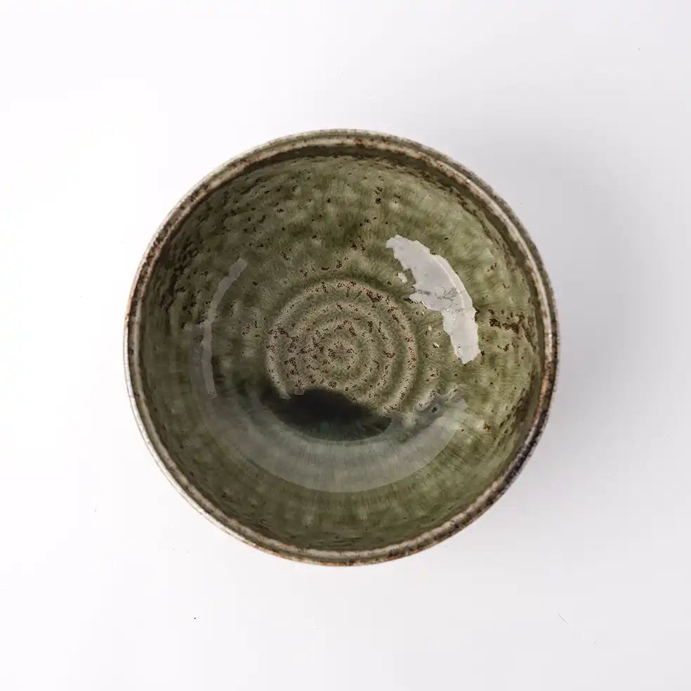 Handmade bowl featuring a moss green gloss with rich brown undertones. The glaze runs over a pattern of concentric circles.