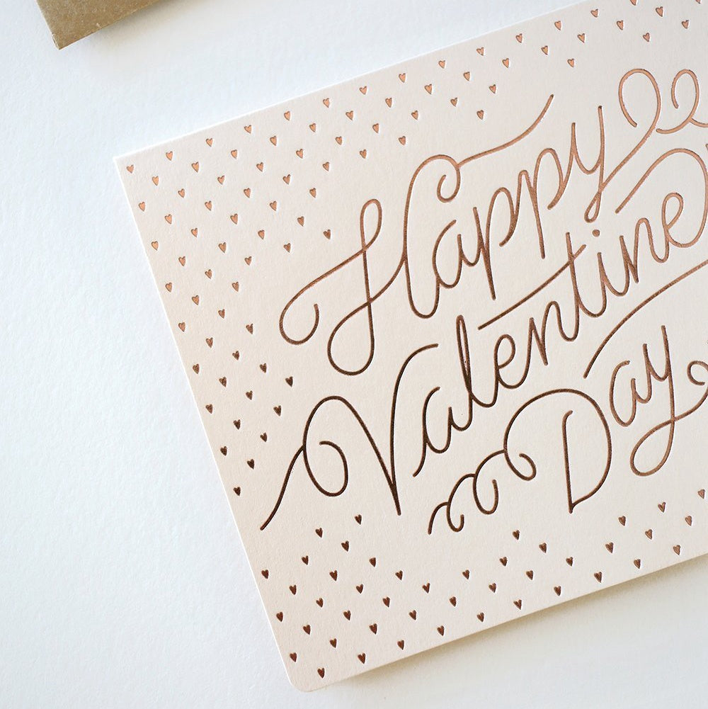 'Happy valentine's day' printed in hot gold foil on blush card with a kraft envelope.