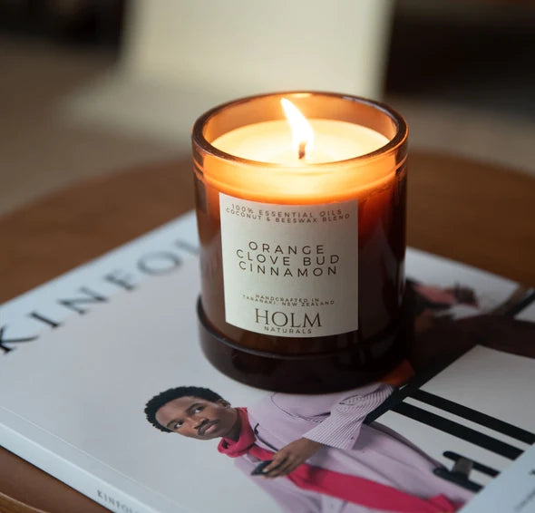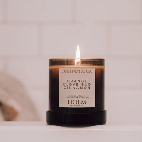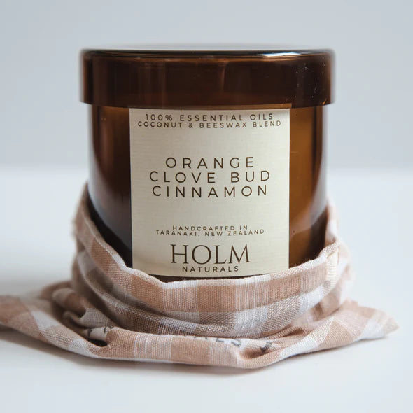 Sweet, warm and spicy with woody notes and citrus undertones describe this custom blend of sweet orange, clove bud and cinnamon essential oils scented candle. The candle has a warm, spicy and uplifting aroma.