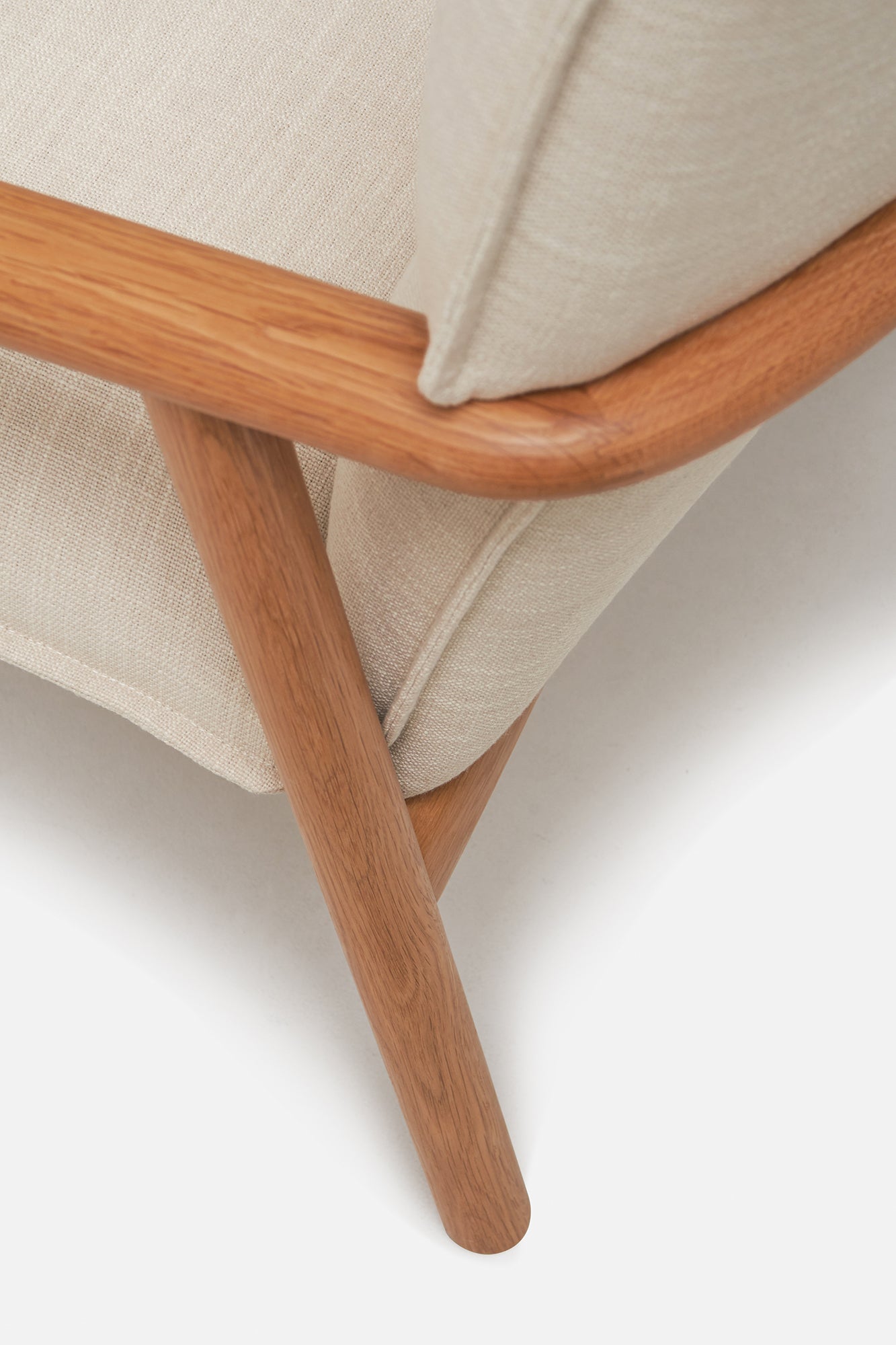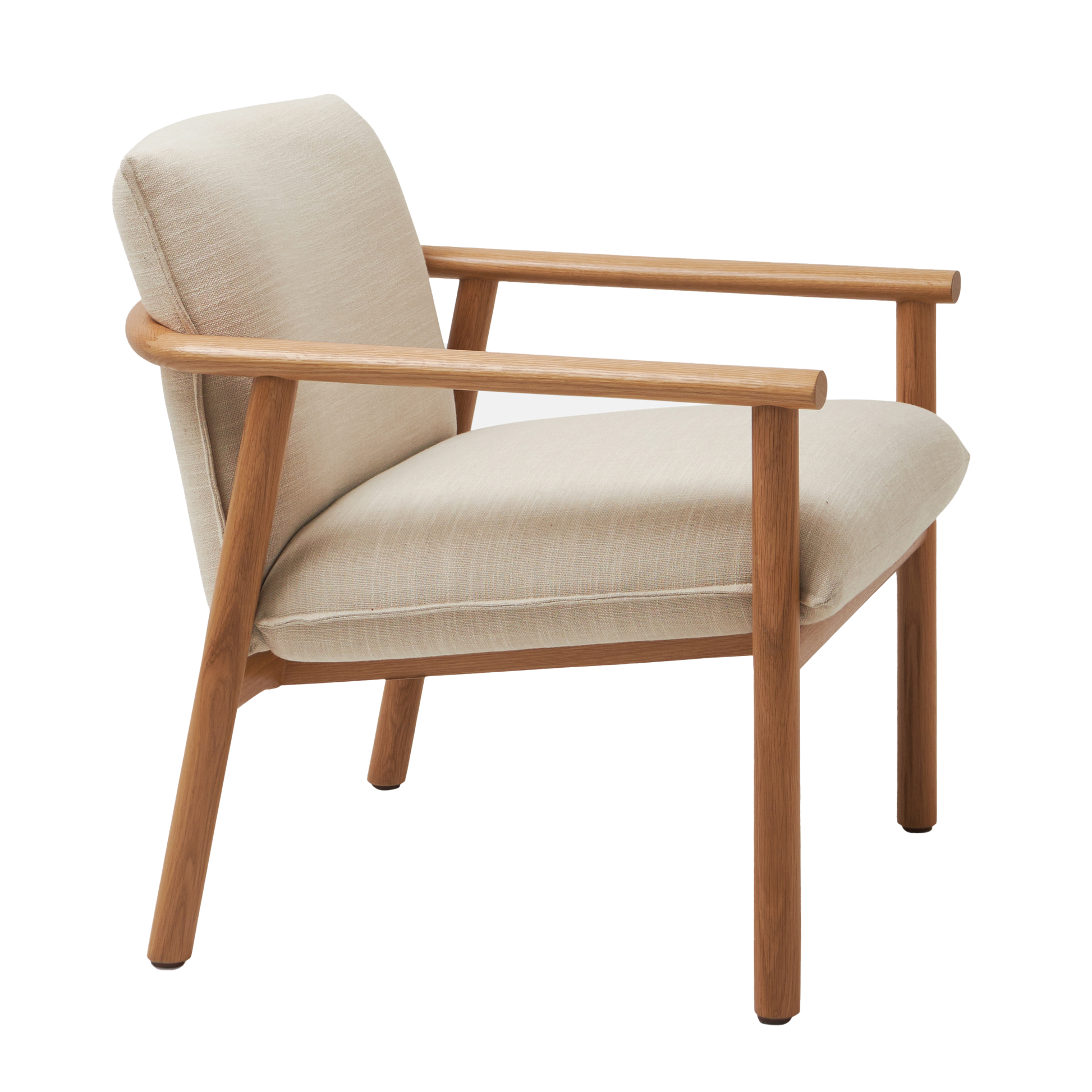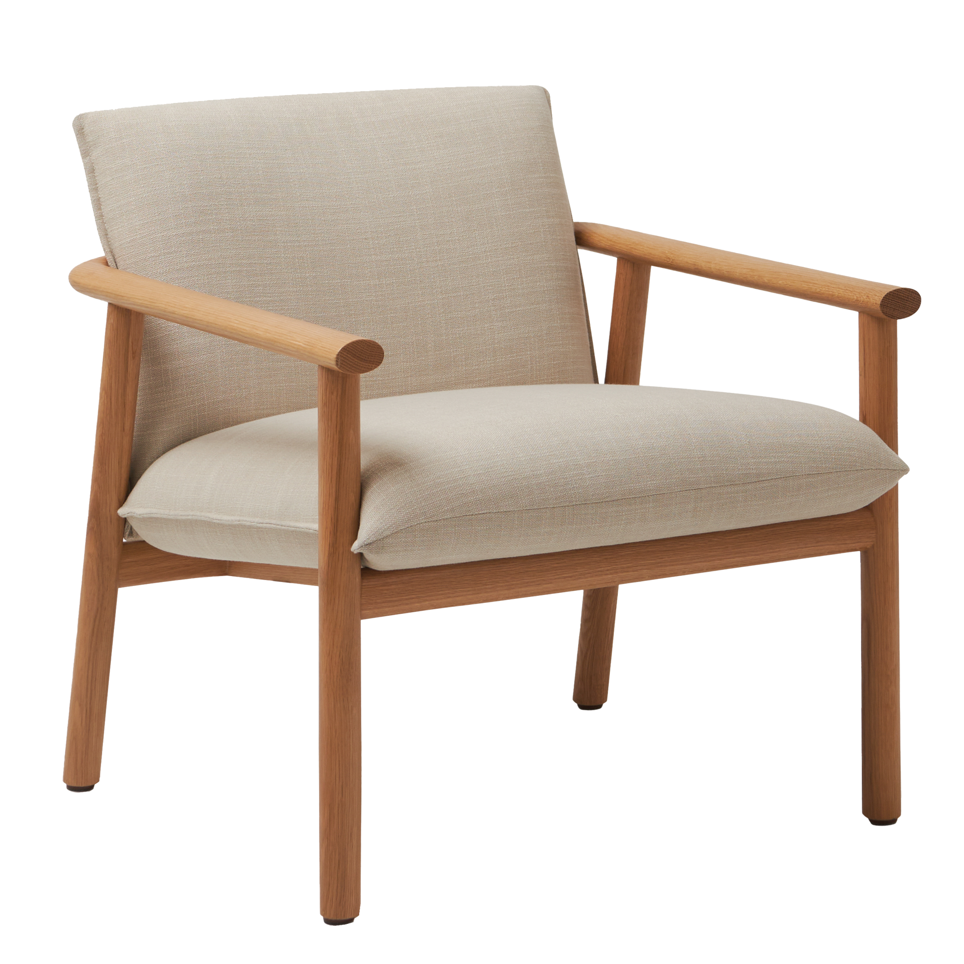 The design considers residential and commercial spaces, and features an oak frame and upholstered cushions. BIFMA-tested for durability and crafted with FSC-certified timber.