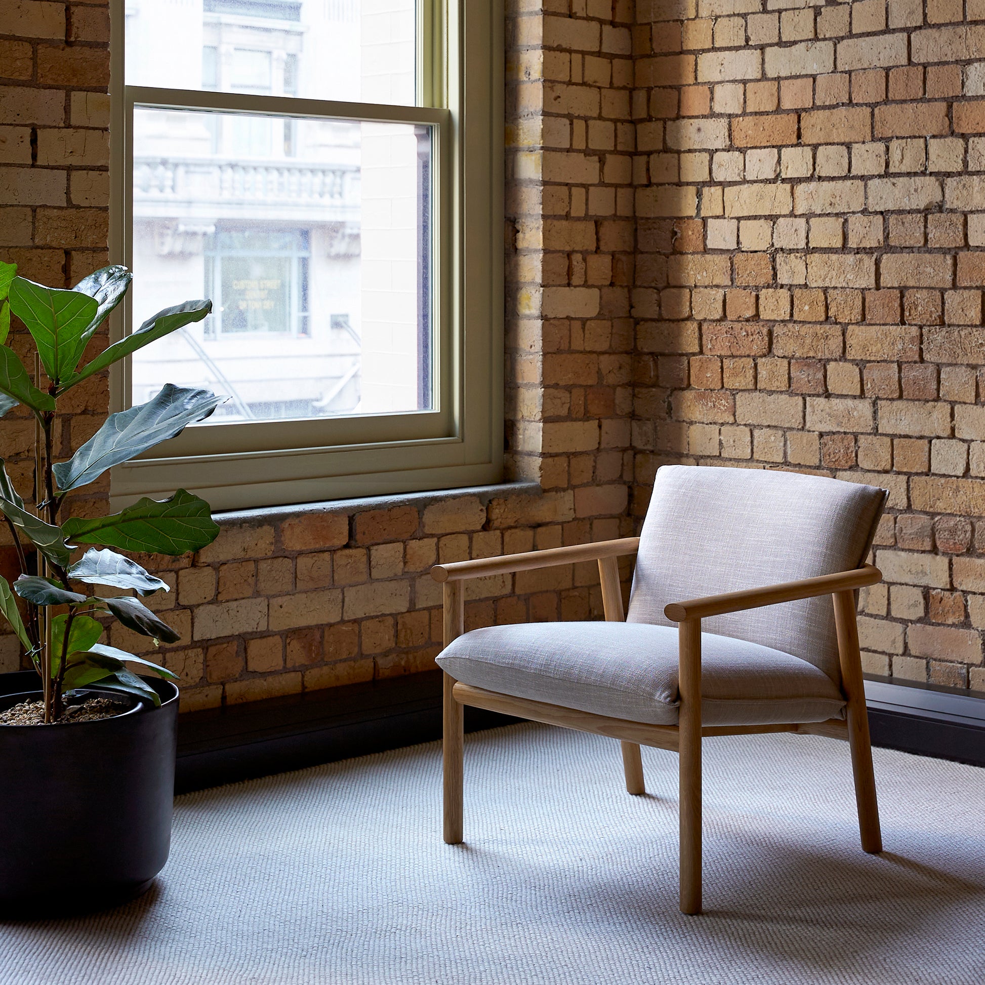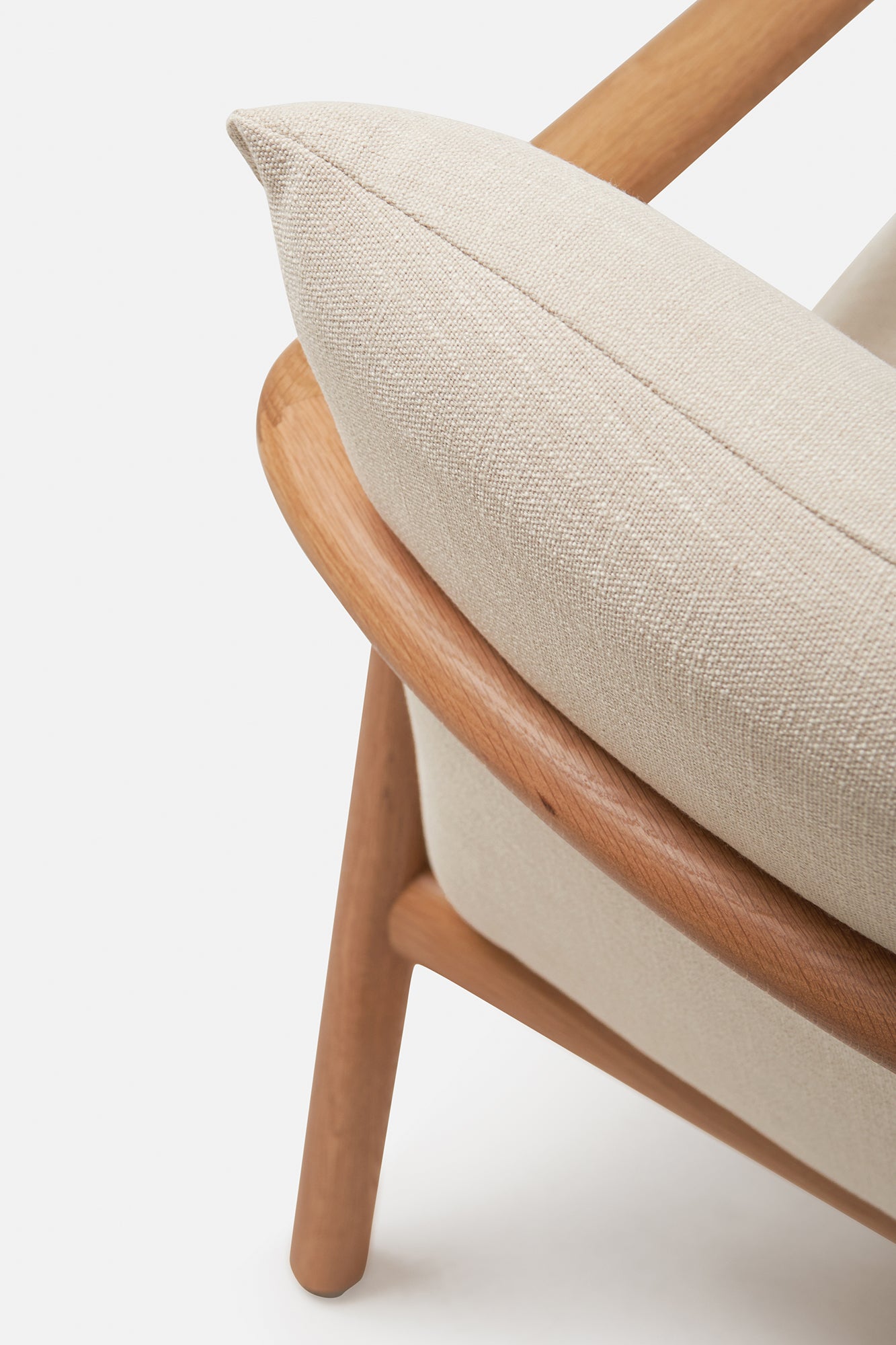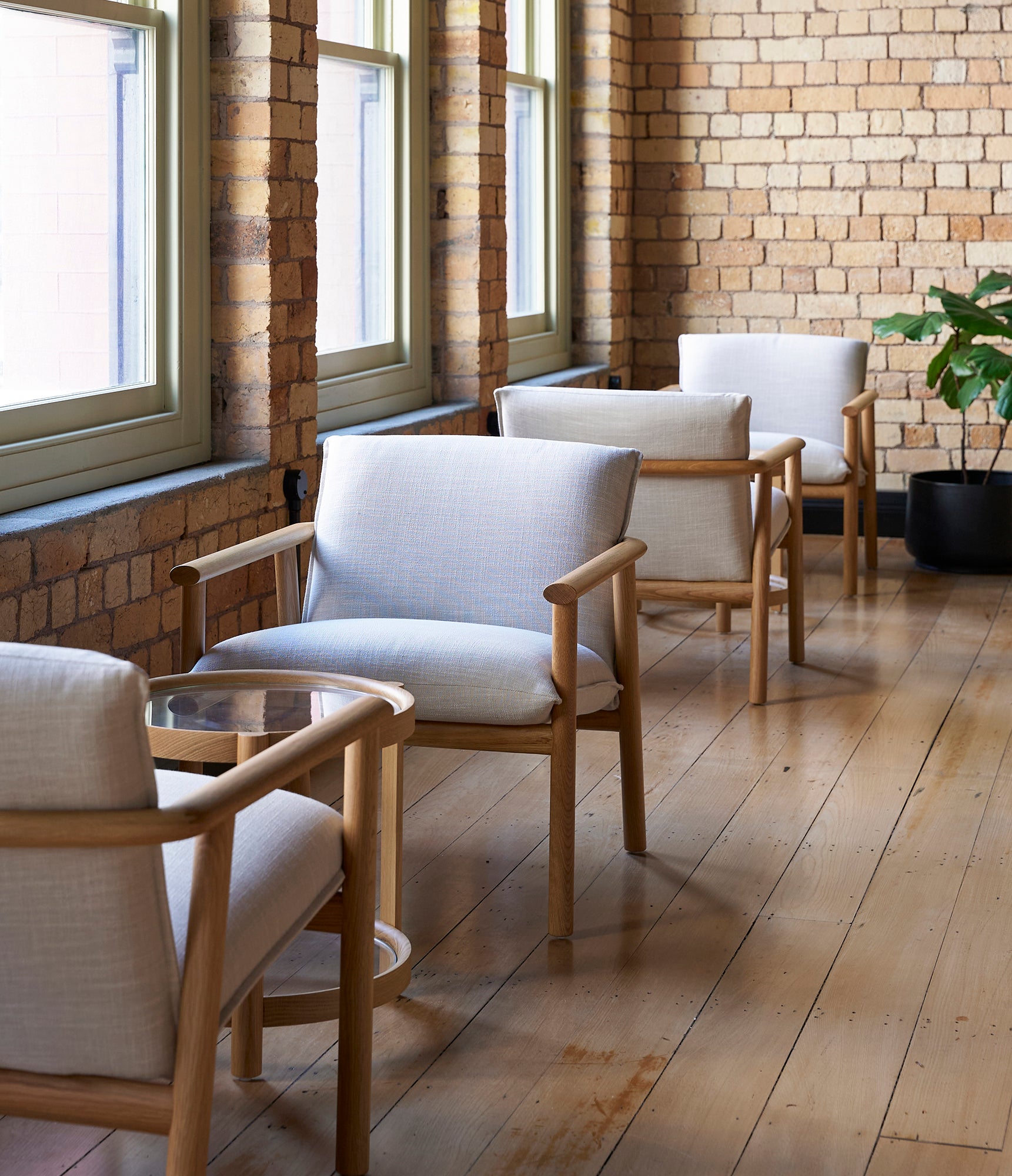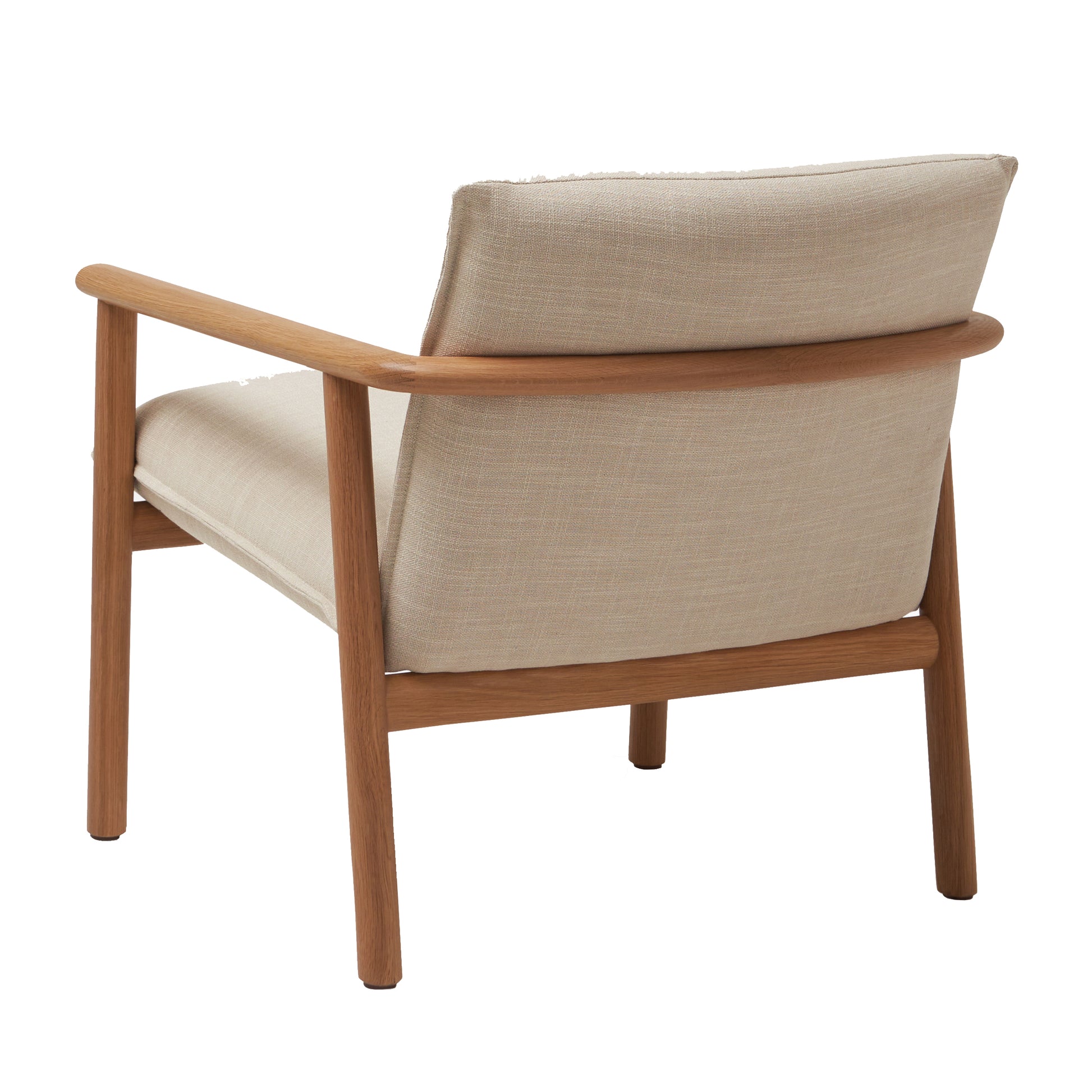 The design considers residential and commercial spaces, and features an oak frame and upholstered cushions. BIFMA-tested for durability and crafted with FSC-certified timber.