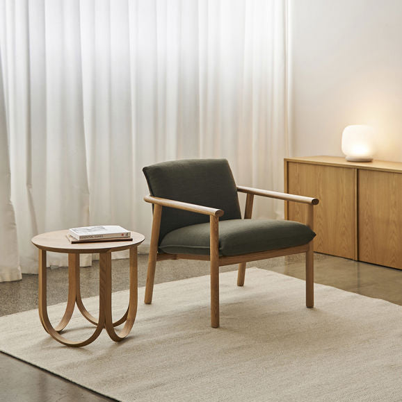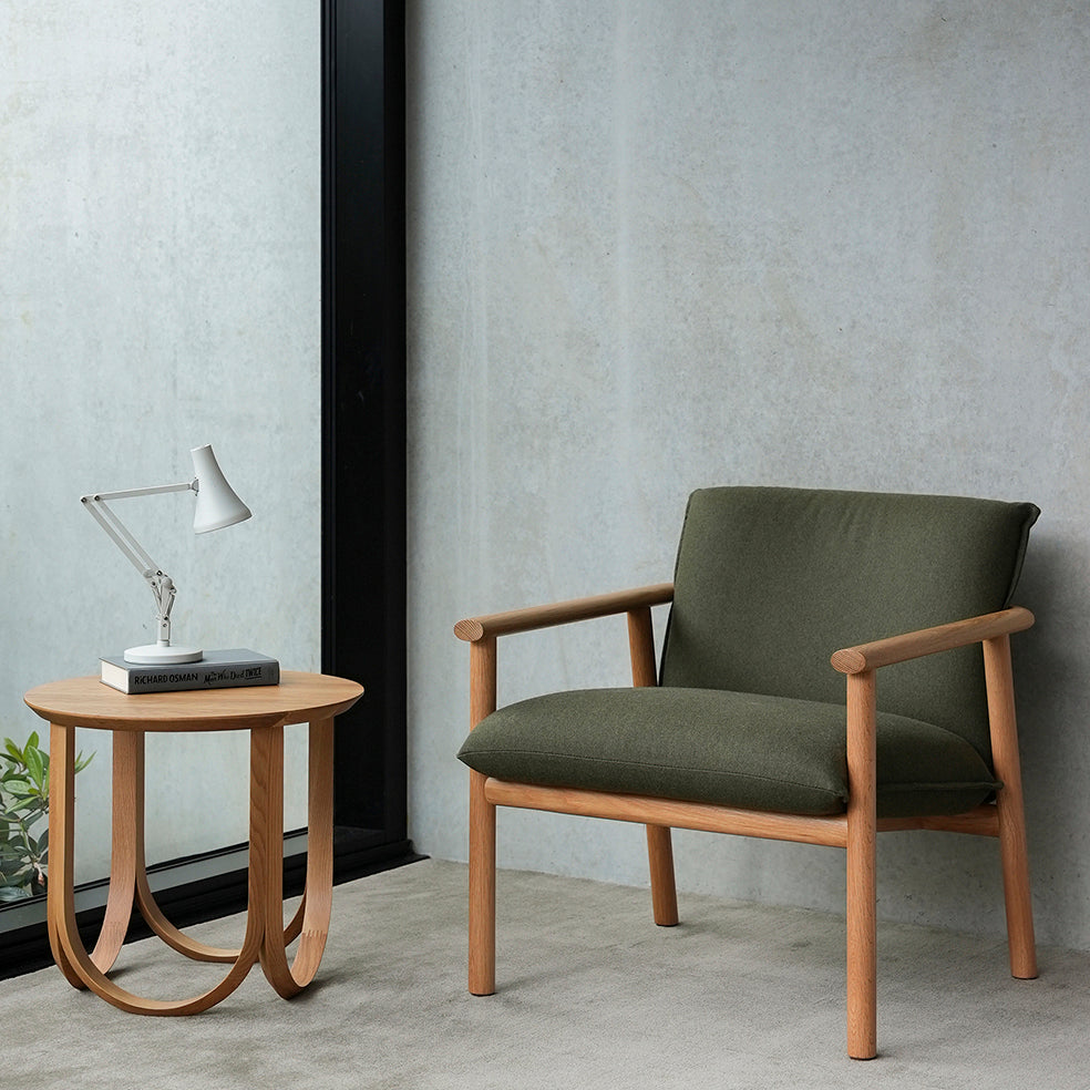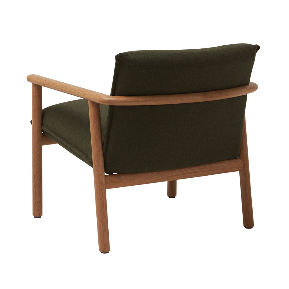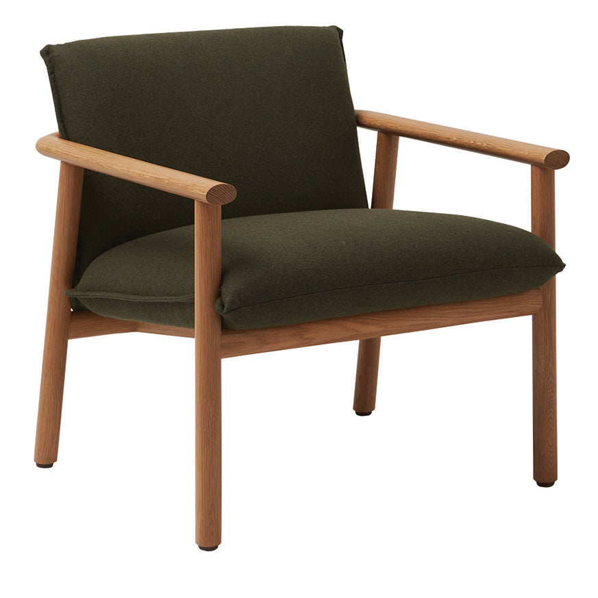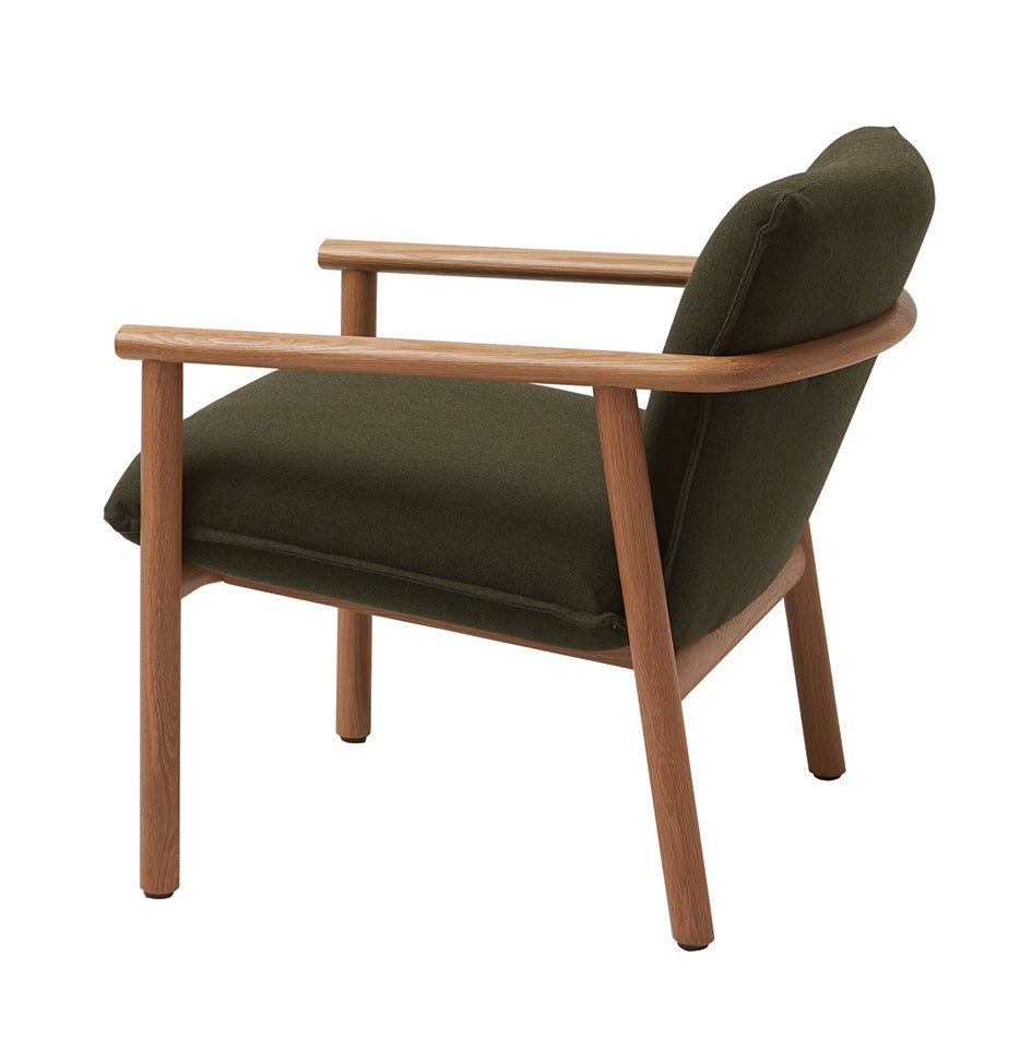 The design considers residential and commercial spaces, and features an oak frame and upholstered cushions. BIFMA-tested for durability and crafted with FSC-certified timber.