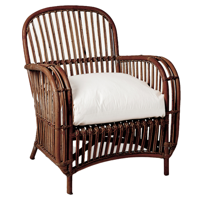 Gorgeous big dark rattan chair featuring boldly rounded arms. The chair is perfectly proportioned for a plump cushion or two. Great for use inside or outside.