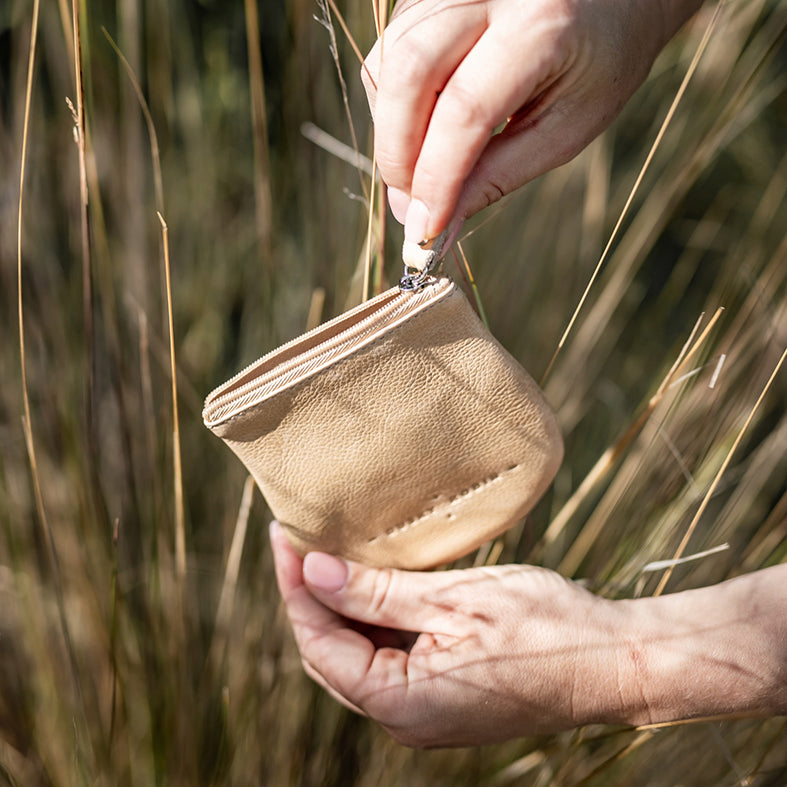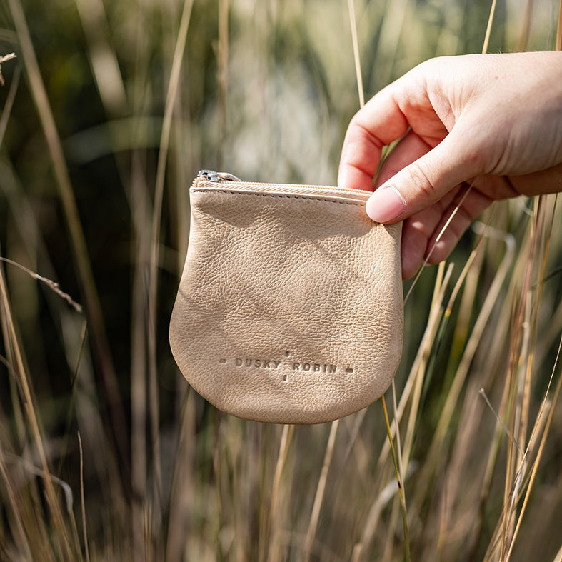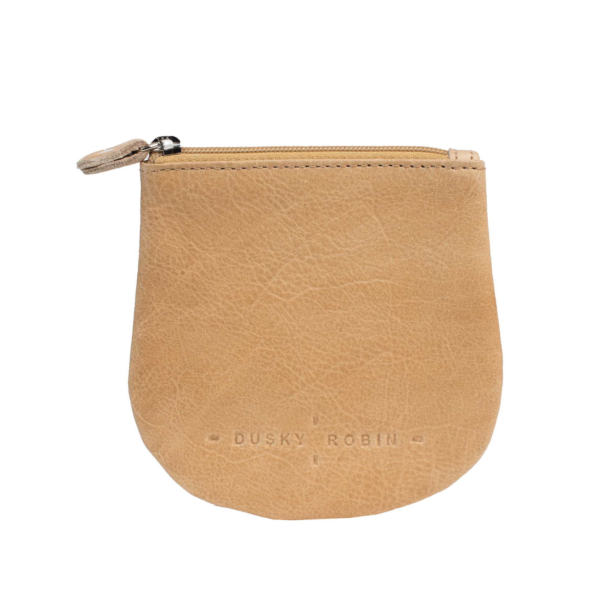 The Lilly Coin Purse is made of super soft leather. It has a zip closure at the top with curved detail at the bottom. There is space for a few cards, coins and folded notes.