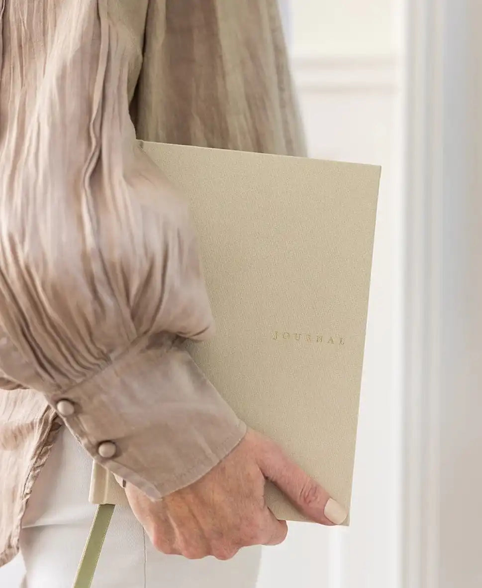A beautifully designed journal featuring a desert sand coloured linen hard cover, with both gold foil lettering and gold gilded edges.