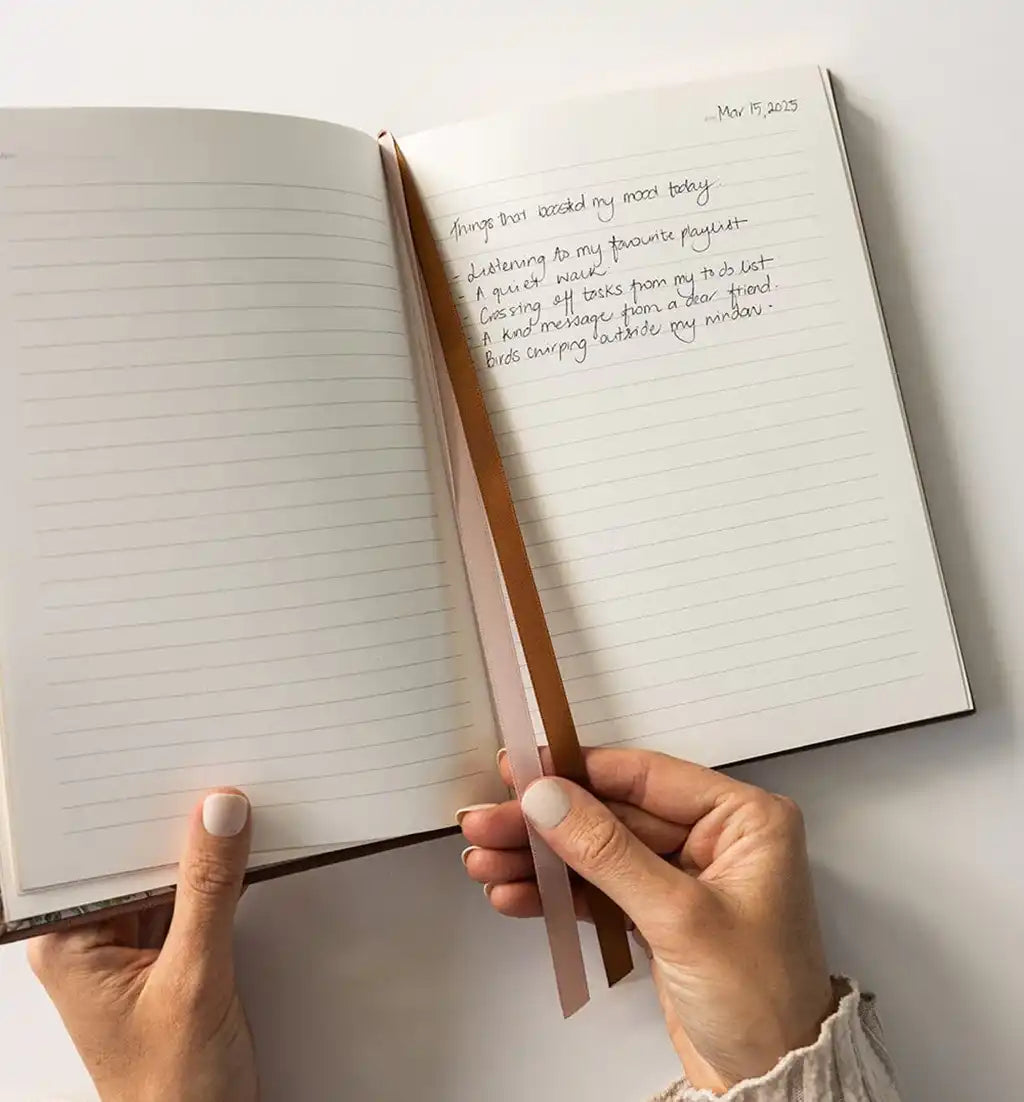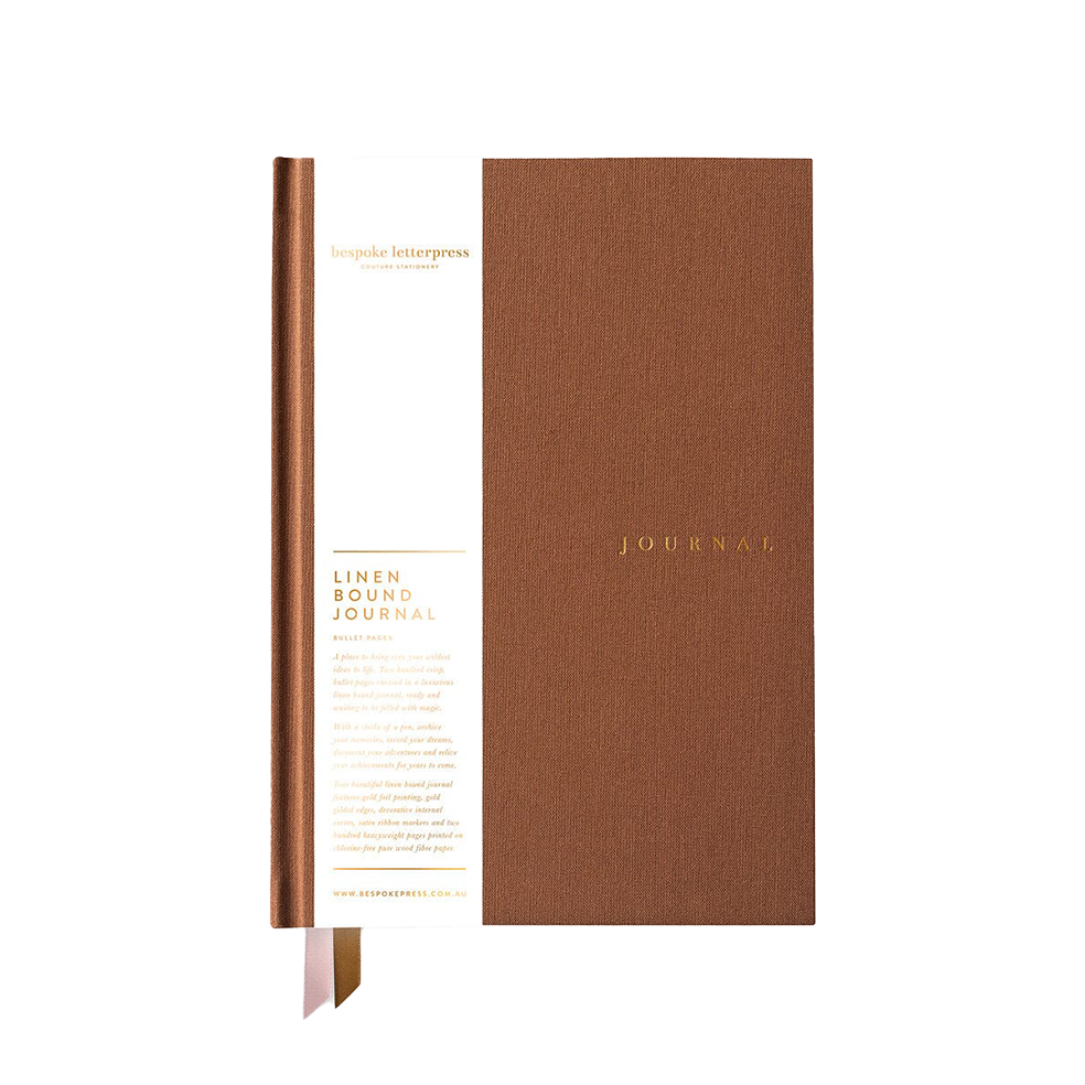 A beautifully designed journal featuring a mocha coloured linen hard cover, with both gold foil lettering and gold gilded edges.