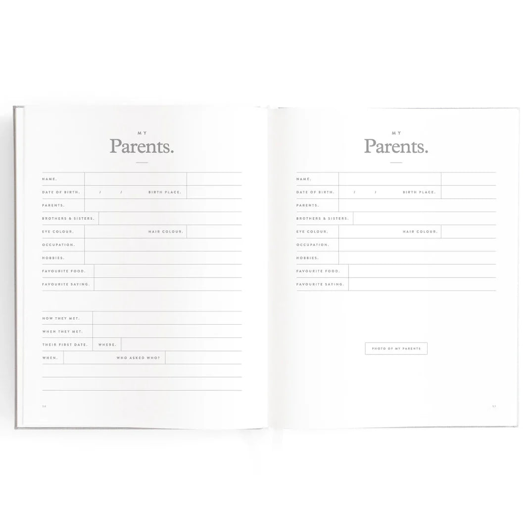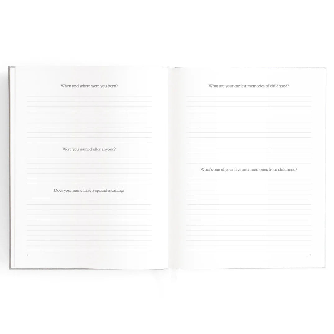 The journal features prompted questions with extra space to write your story. It includes memories of childhood, family & friends, love life, work life, hobbies, leisure & travel, family profiles & family tree, time capsule, places I’ve visited, map, bucket list, reflections and more.