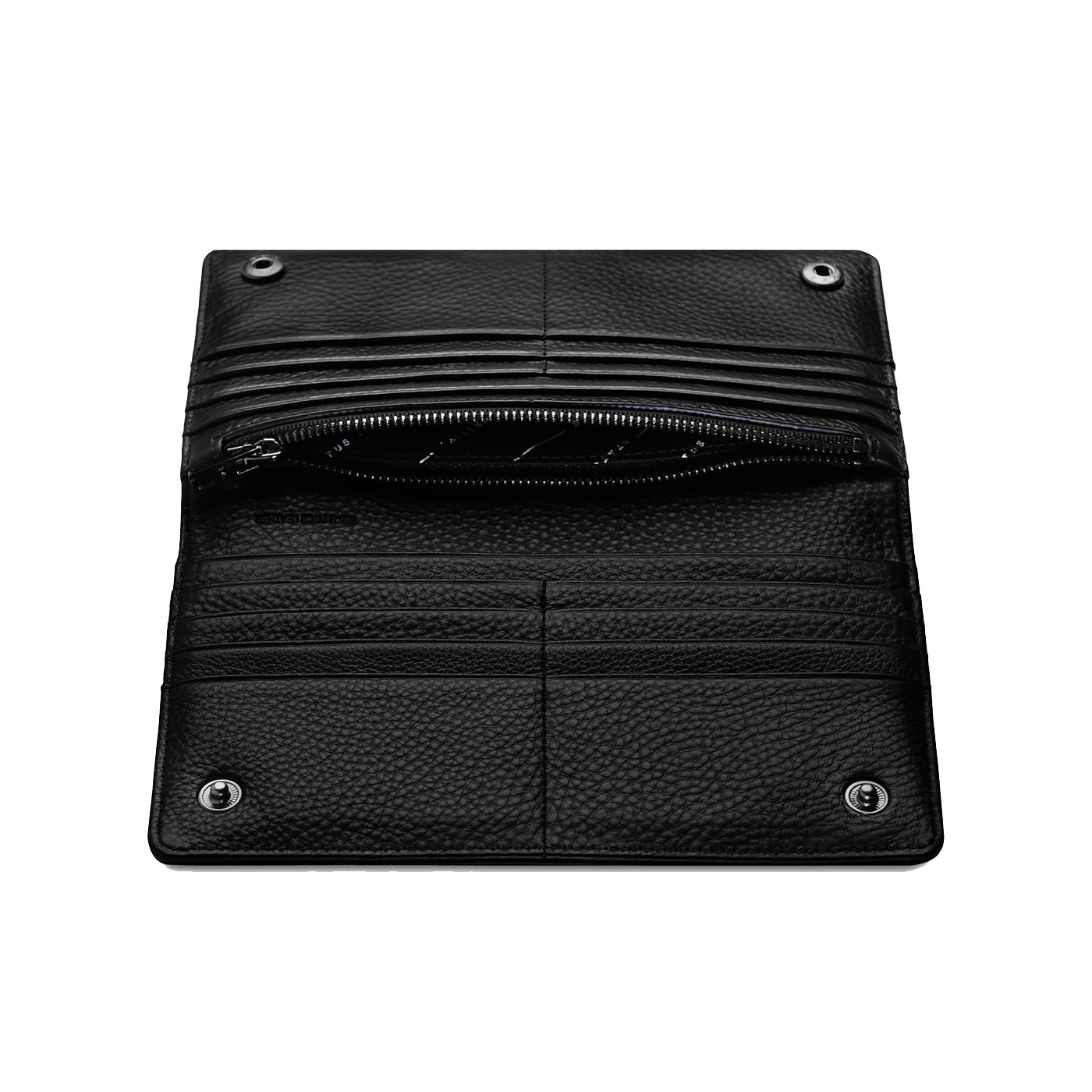 This great sized wallet opens out to reveal 14 card slots that can fit up to 28 cards, an internal coin zip, 2 banknote sleeves and an external slider pocket on the back for phone or cash.