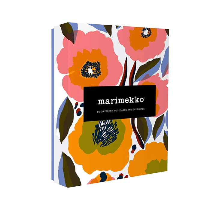A boxed set of 16 Marimekko floral-design notecards and envelopes. The cards feature cheerful floral prints in bold colours. Cards are blank inside.