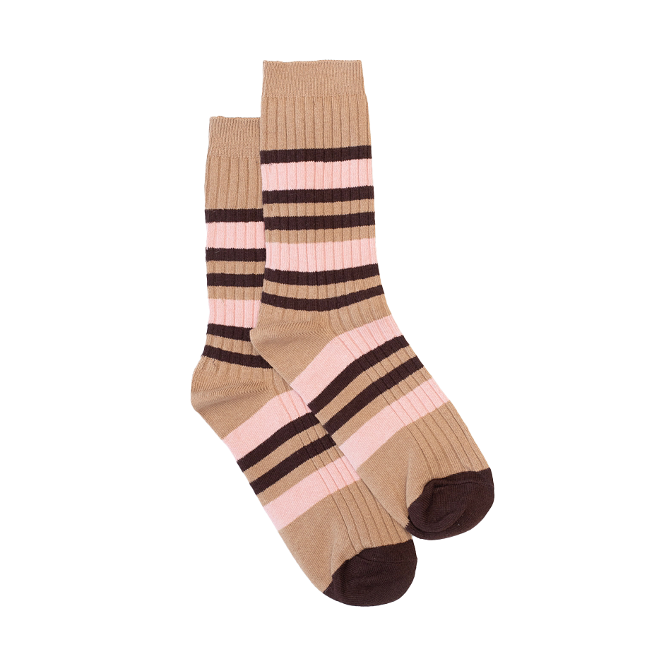 Complete your outfit with these taupe coloured socks featuring a blush pink and chocolate stripes.