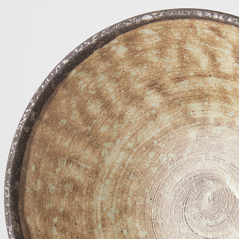This handmade bowl features a circular sweep of golden ochre on a earth tone glaze.