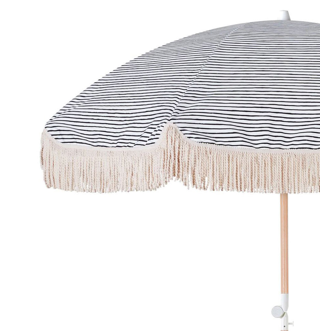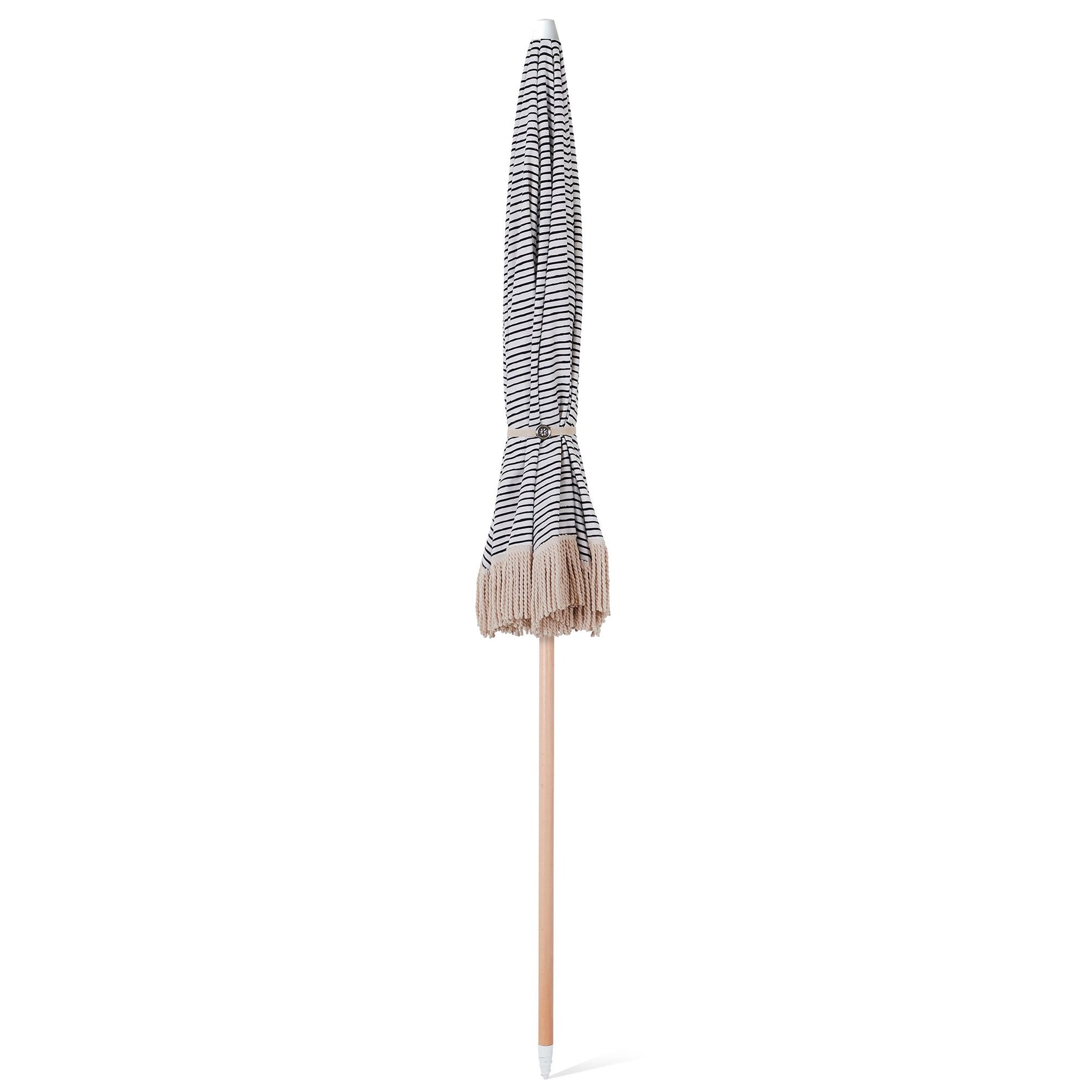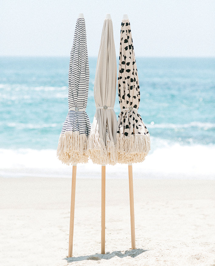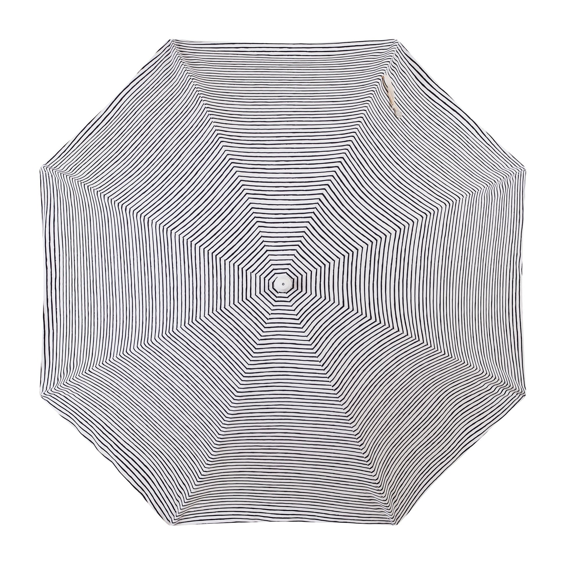 The Natural Instinct beach umbrella is designed by Byron Bay-based, Sunday Supply Co. The umbrella features a simple, unique take on the classic stripe, tailored for the modern beach goer. A classy, thin, black/charcoal hand-drawn line makes for a subtle texture up close.